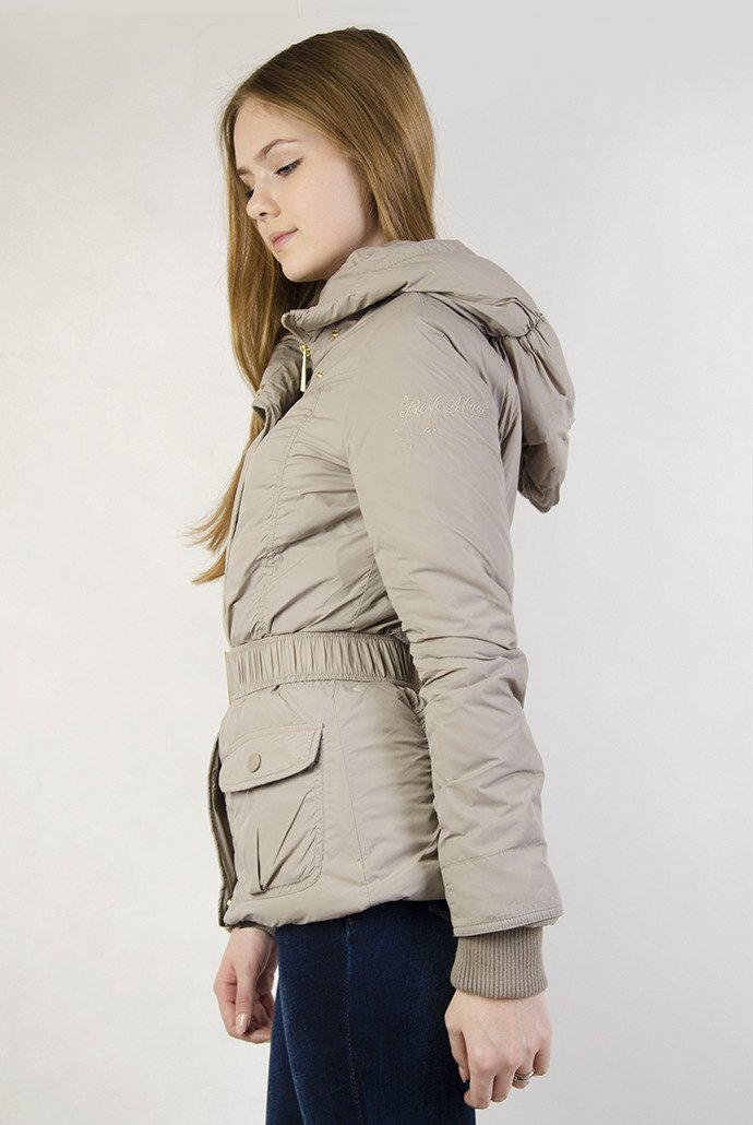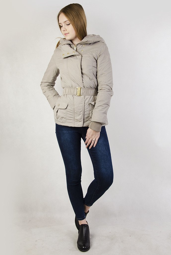 Krótka taliowana kurtka, zapinana na suwak, oraz pasek. Kurtka z kapturem, z możliwością zwinięcia go w kołnierz.