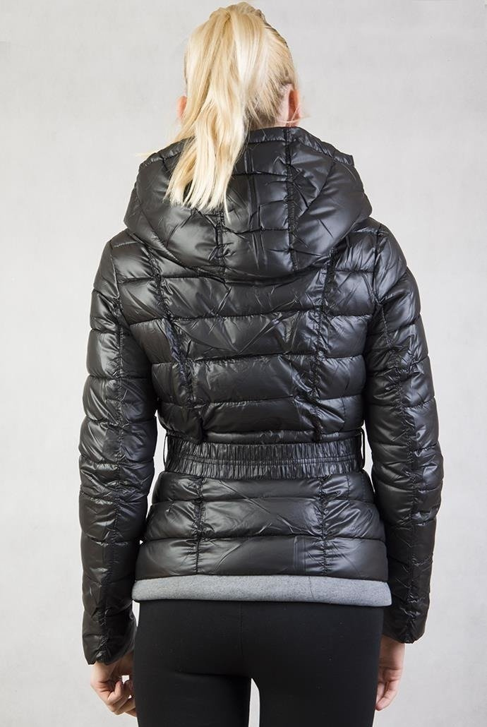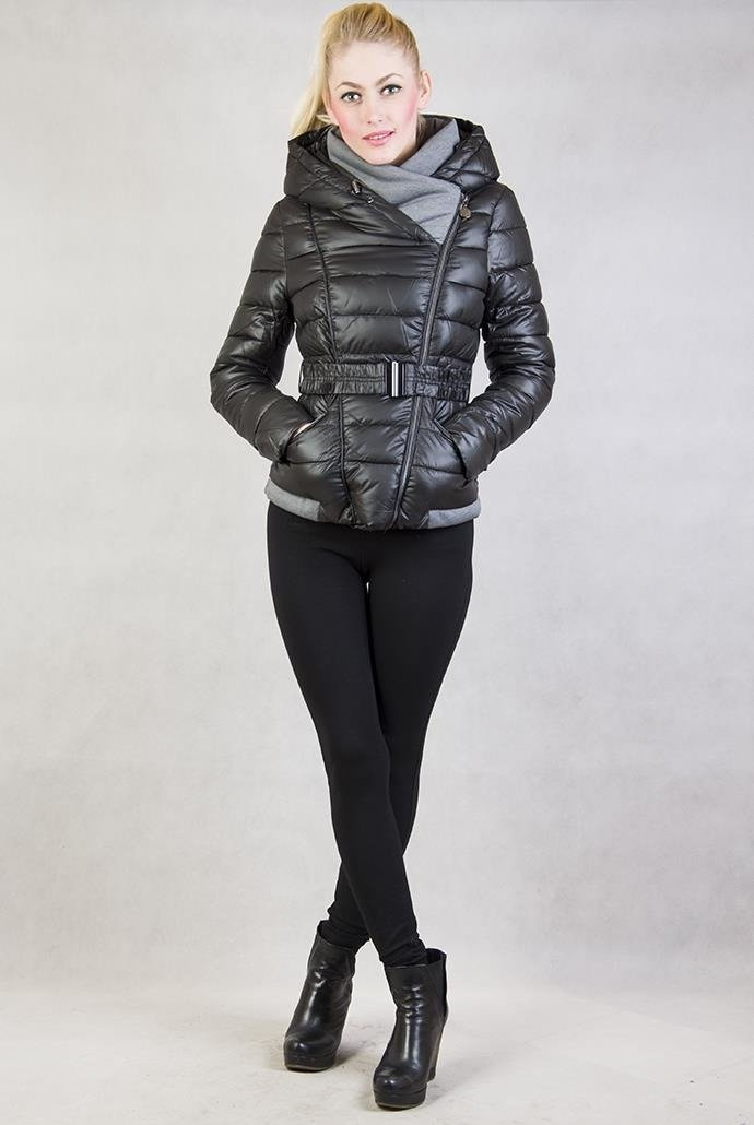 Czarna kurtka zimowa zapinana na zamek oraz ściągana paskiem. Kaptur z bawełnianą podszewką. W środku ocieplana futerkiem.