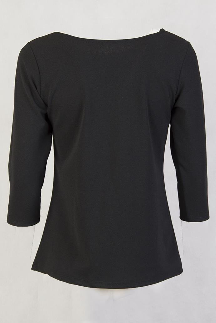 Czarna bluzka z cyrkoniami przy dekolcie.