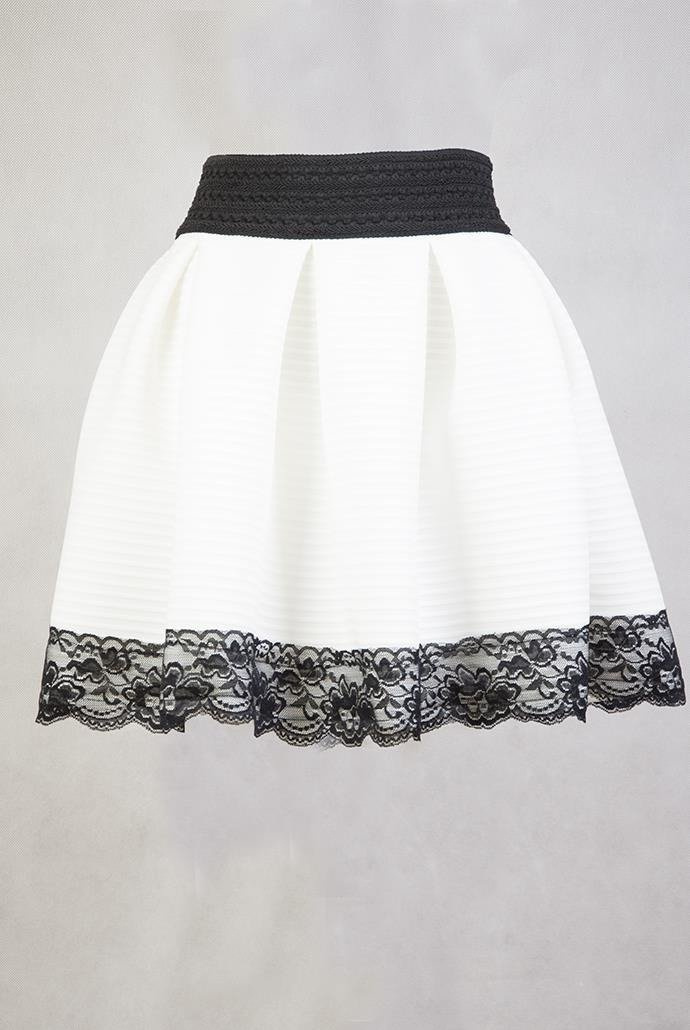 Biała spódnica bombka ściągana gumką w pasie, na dole obszyta koronką.