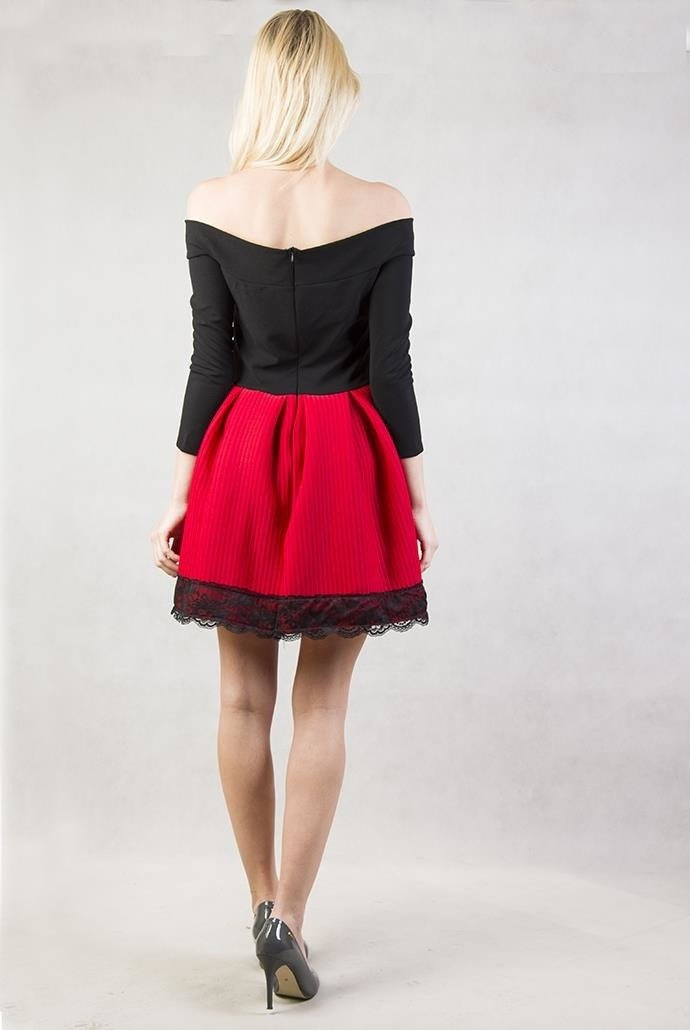 Czarno-czerwona sukienka rozkloszowana, obszyta koronką u dołu.