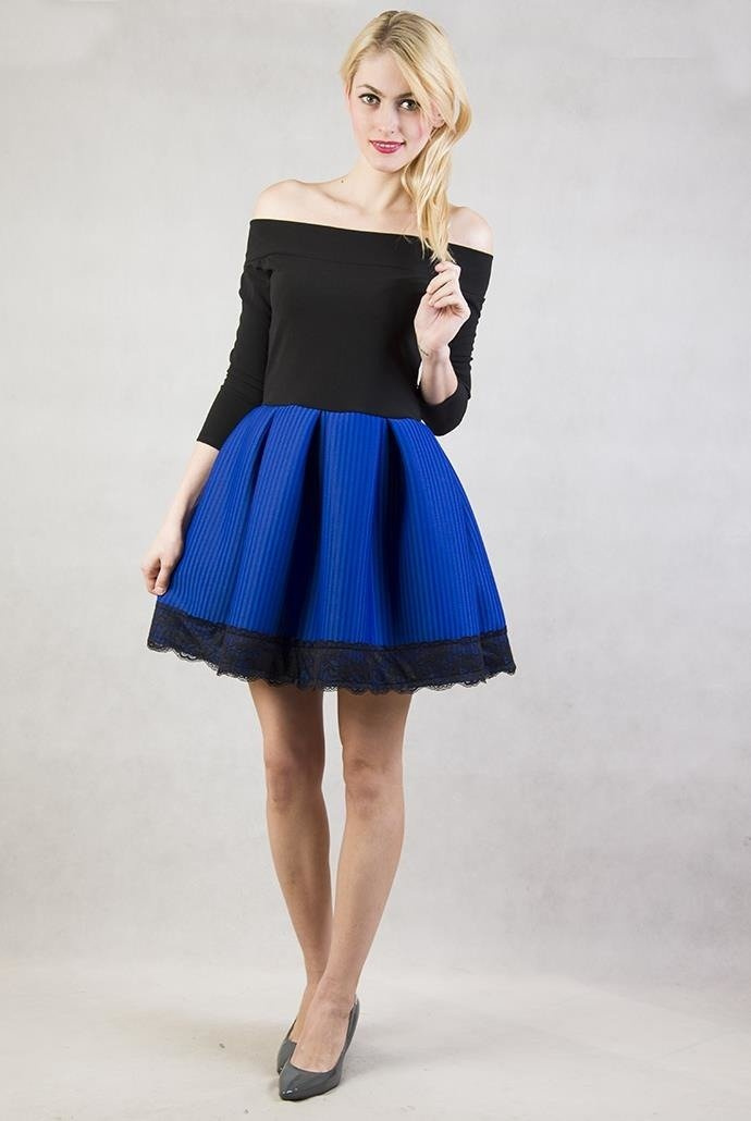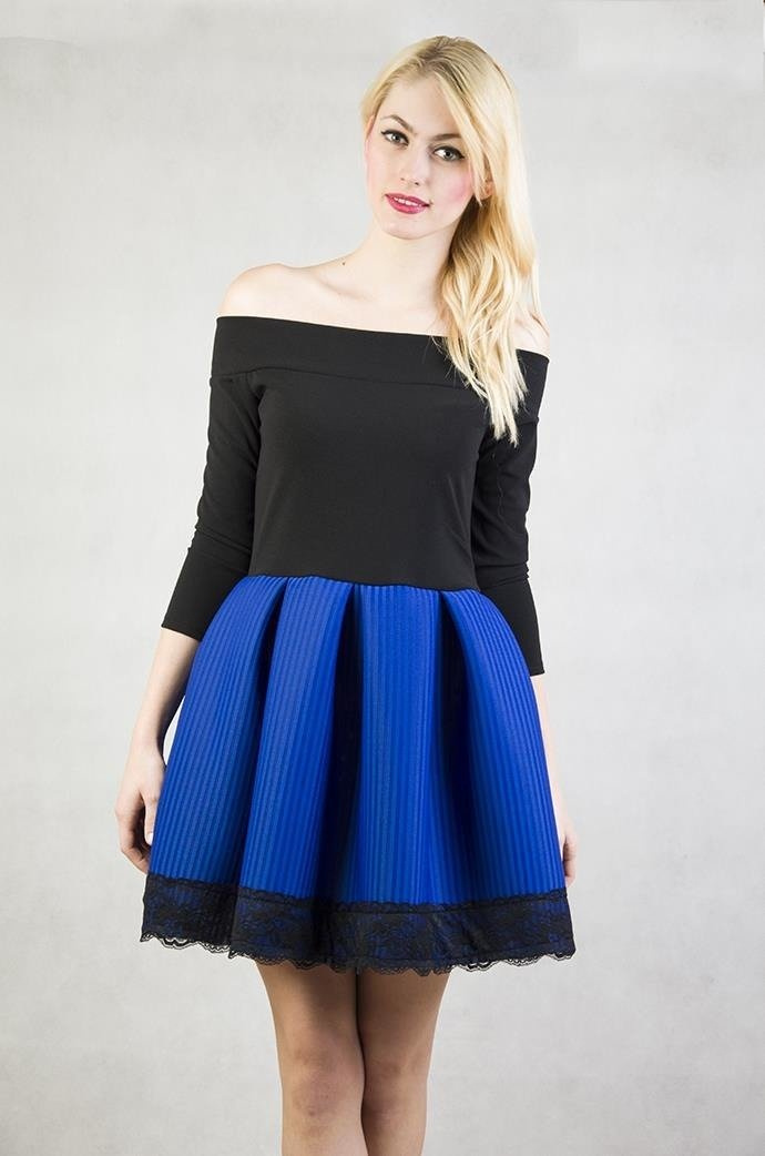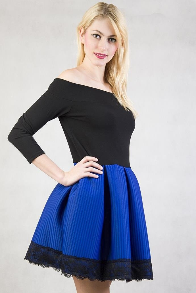 Czarno-granatowa sukienka rozkloszowana, obszyta koronką u dołu.