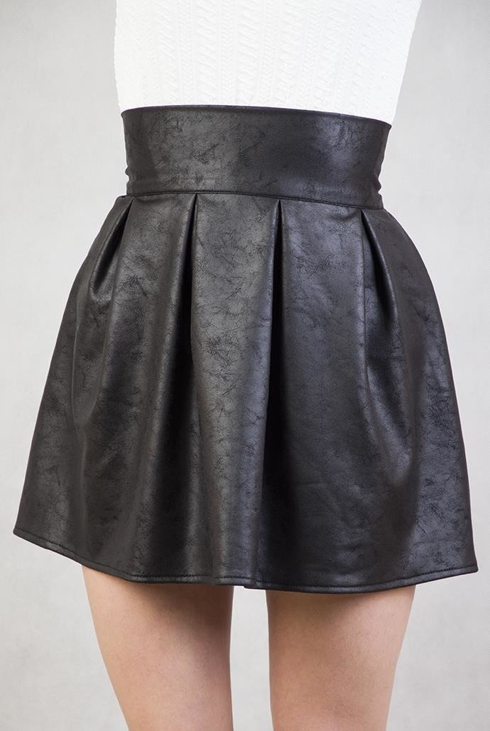 Czarna, dekatyzowana spódnica skórka zapinana na zamek.