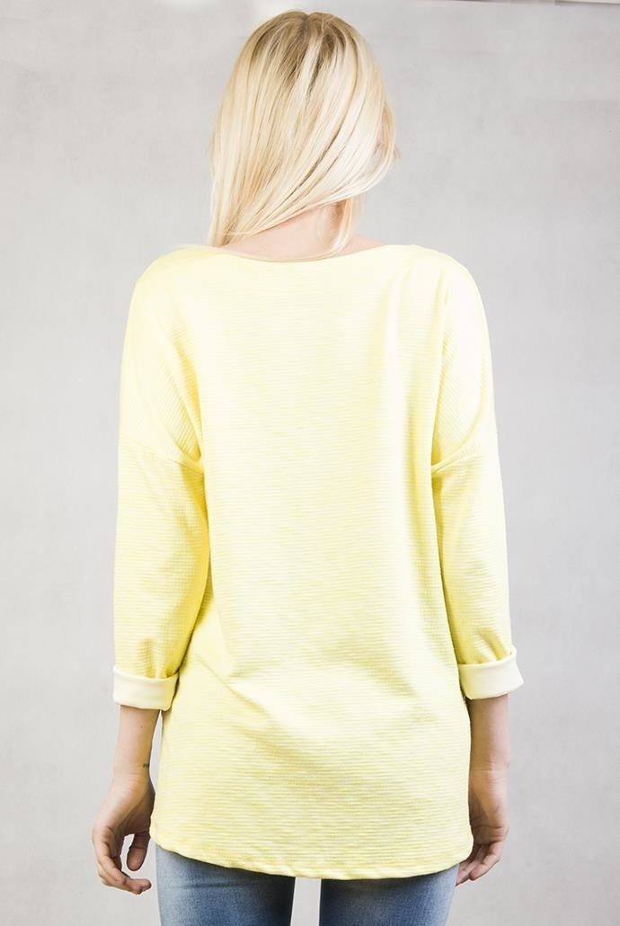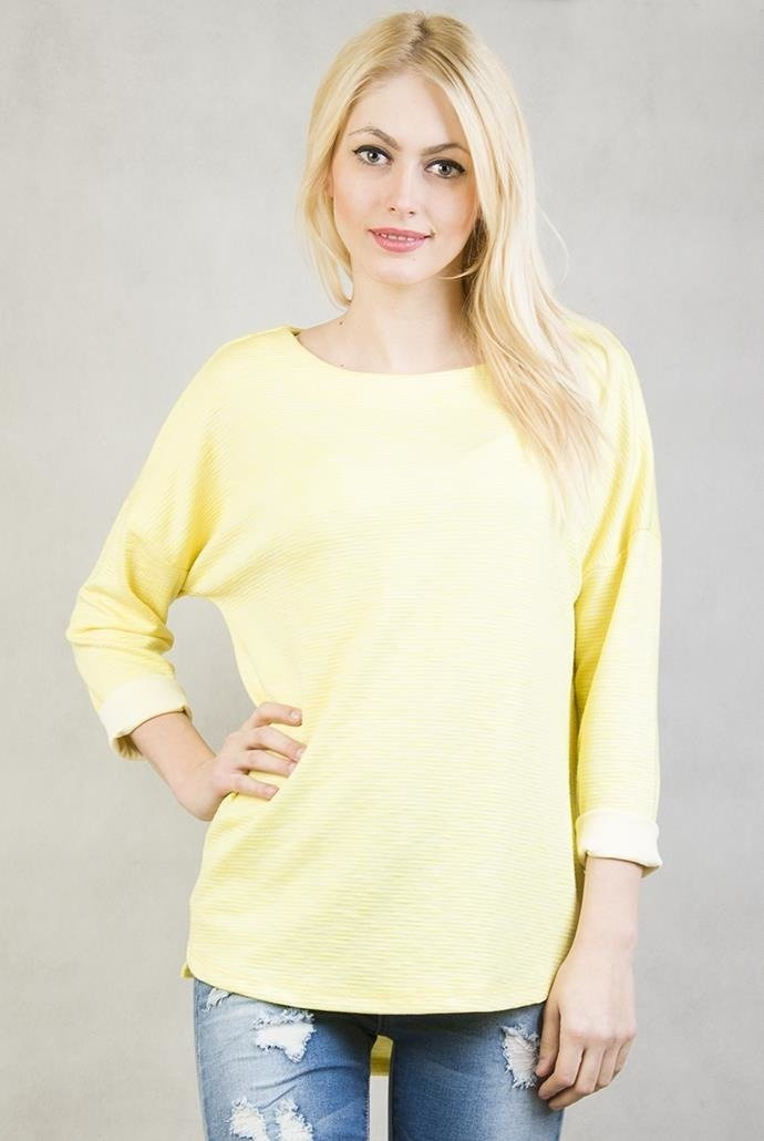 Żółta, asymetryczna bluzka z rozcięciami po bokach.