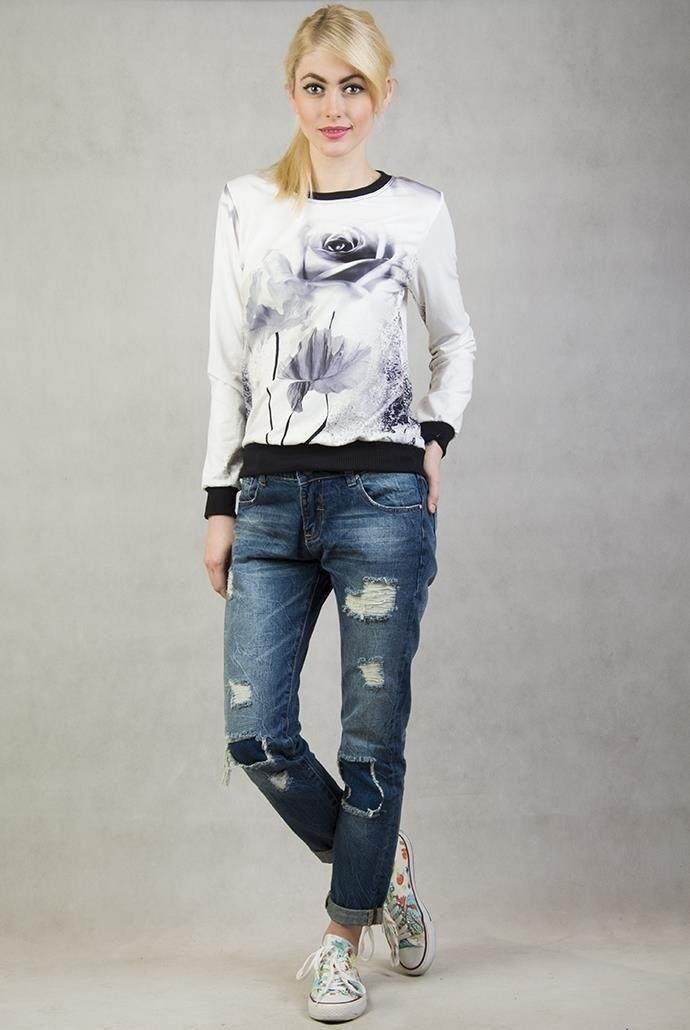 Biała bluza z kwiatami róży, ściągacz na rękawach oraz na dole.