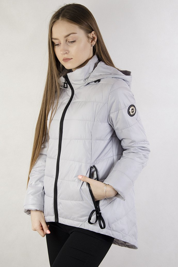 Asymetryczna szara kurtka z kapturem zapinana na zamek.
