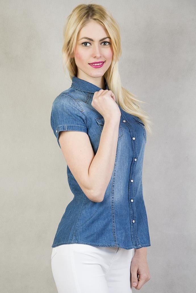 Jasno-niebieska koszula jeansowa na krótki rękaw, zapinana na zatrzaski.