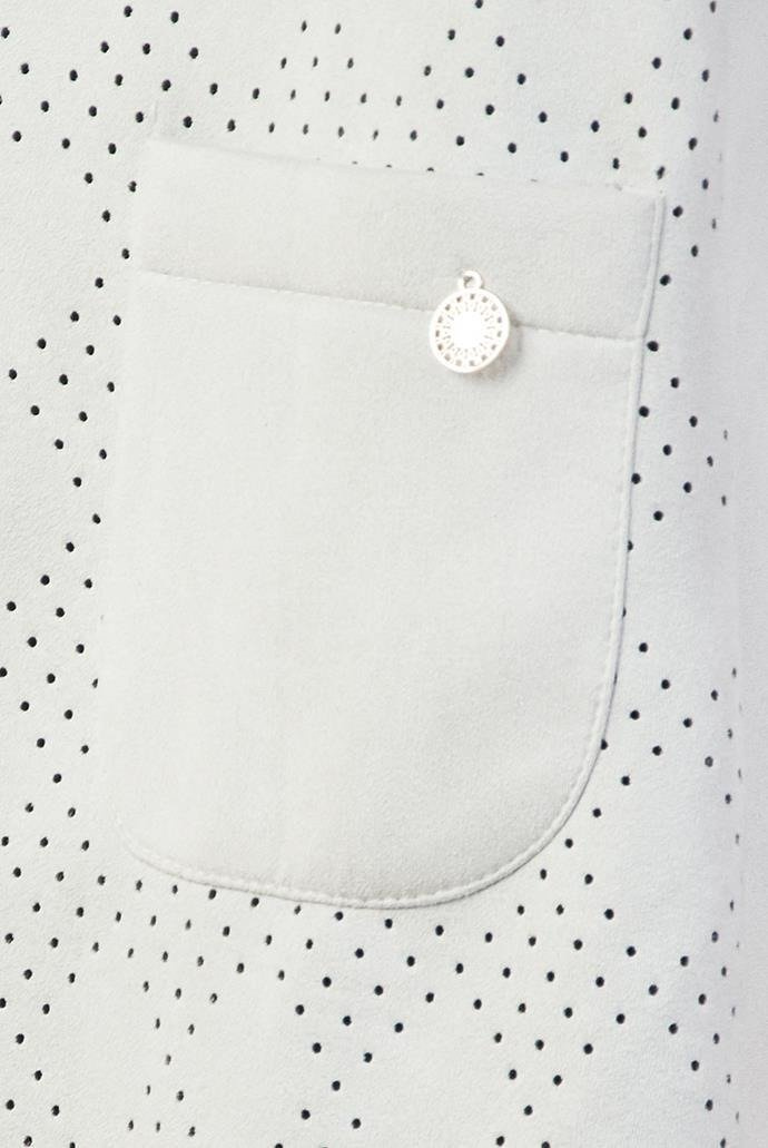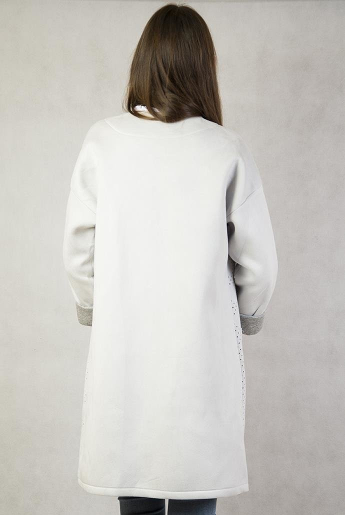 Szara narzutka zamszowa z ażurowym przodem oraz kieszonką.