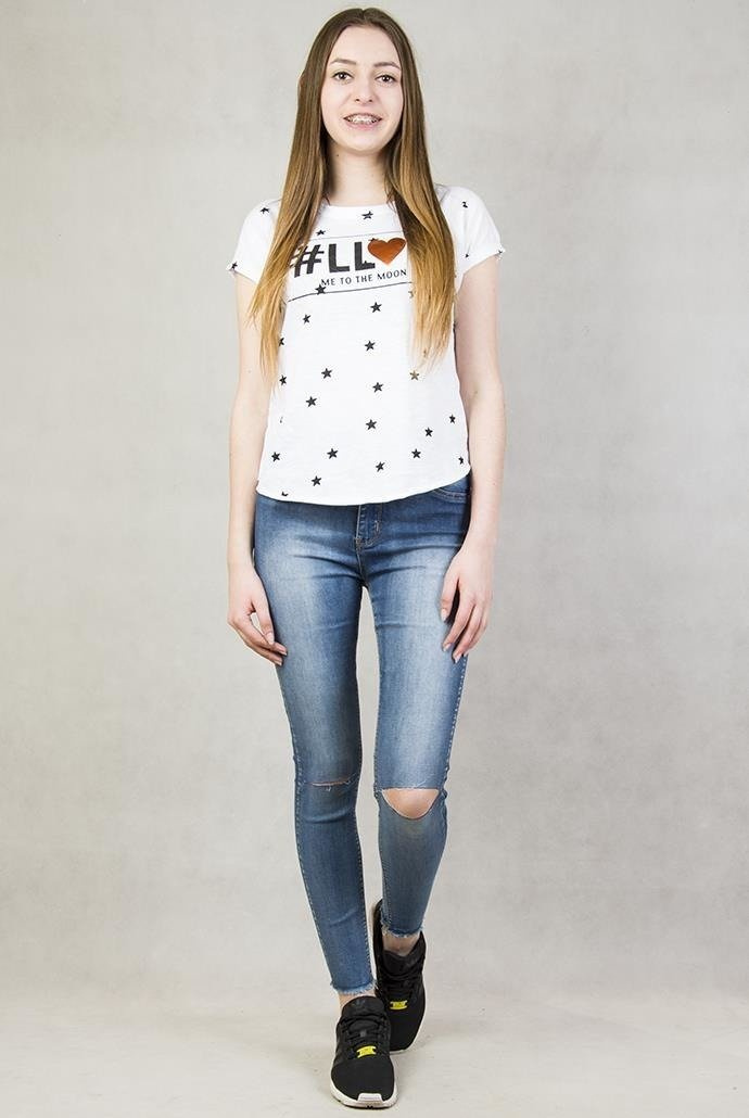 Biała bluzka w gwiazdki z napisem F#llow me to the moon