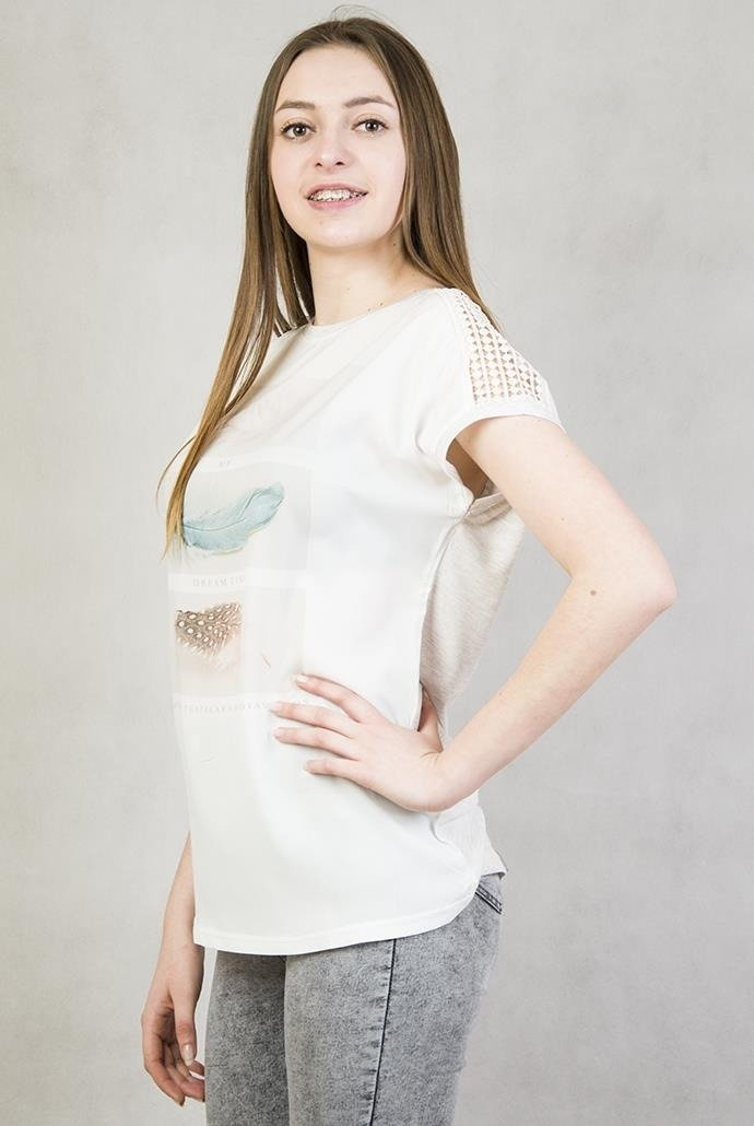 Beżowa bluzka ze sztampą w piórka oraz koronkowymi wstawkami na ramionach.