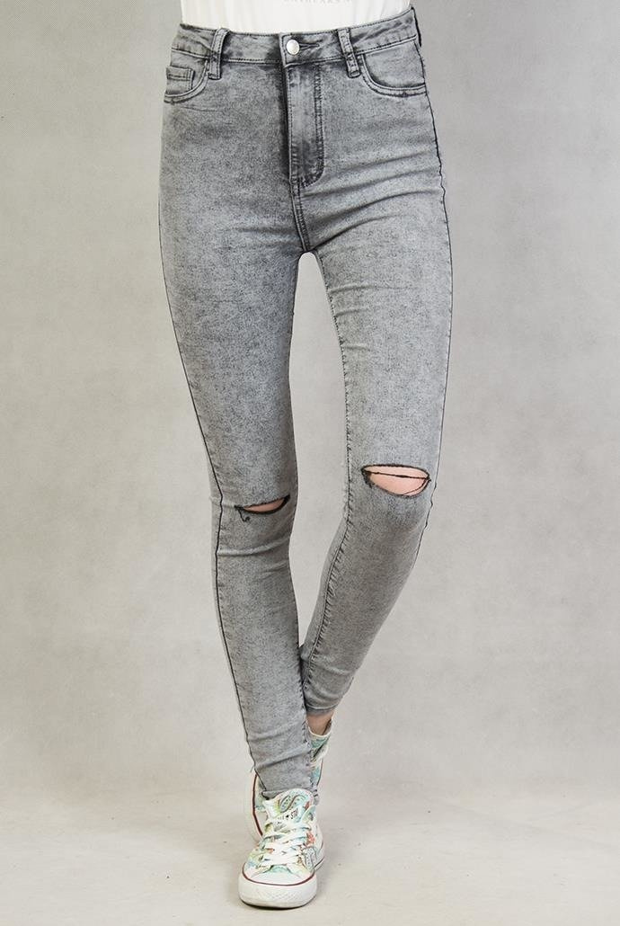 Szare spodnie marmurkowe z wysokim stanem oraz rozcięciami na kolanach.