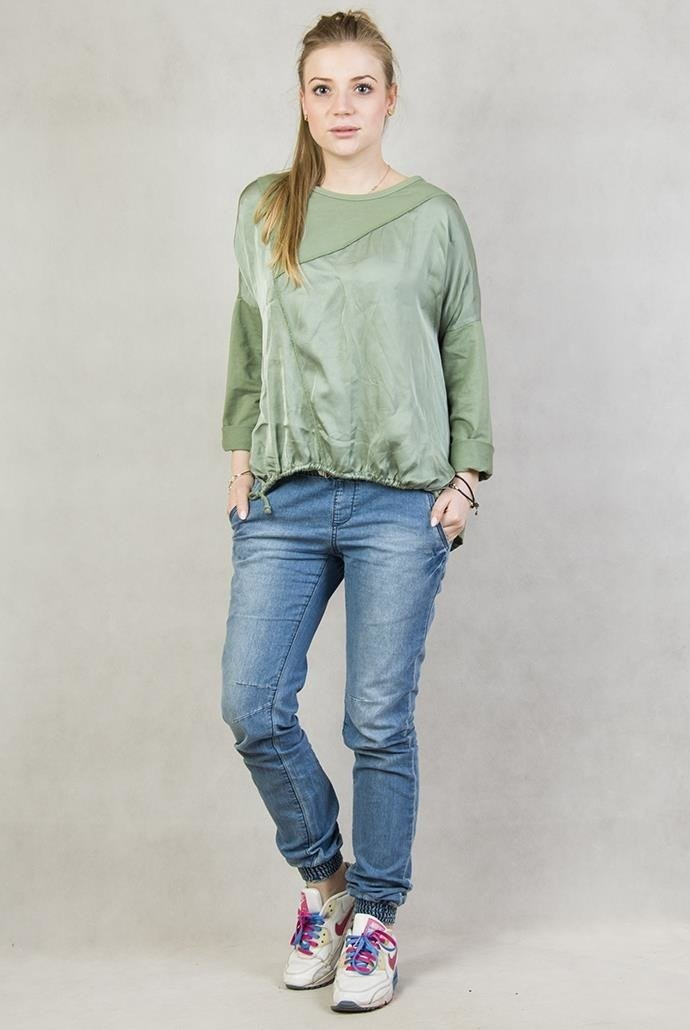 Zielona, asymetryczna bluzka z satyną, ściągana sznurkiem na dole.