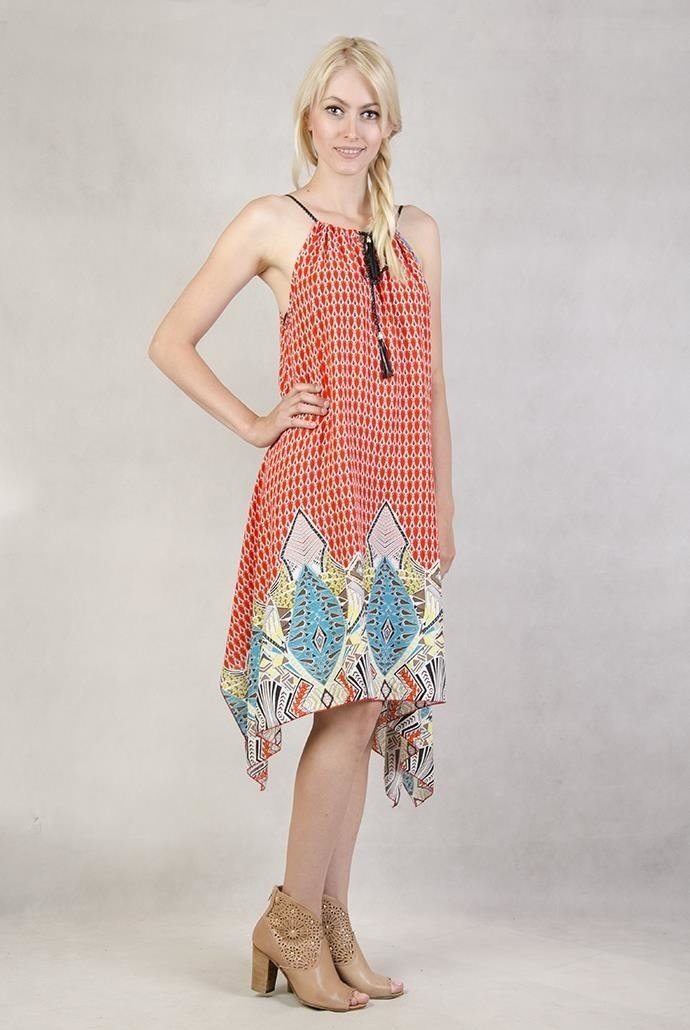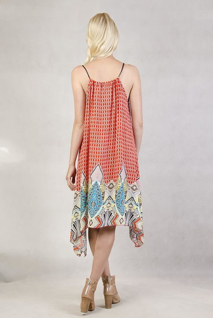 Wzorzysta sukienka z dłuższymi bokami pomarańczowa. Długość ramiączek regulowana na czarnym rzemyku