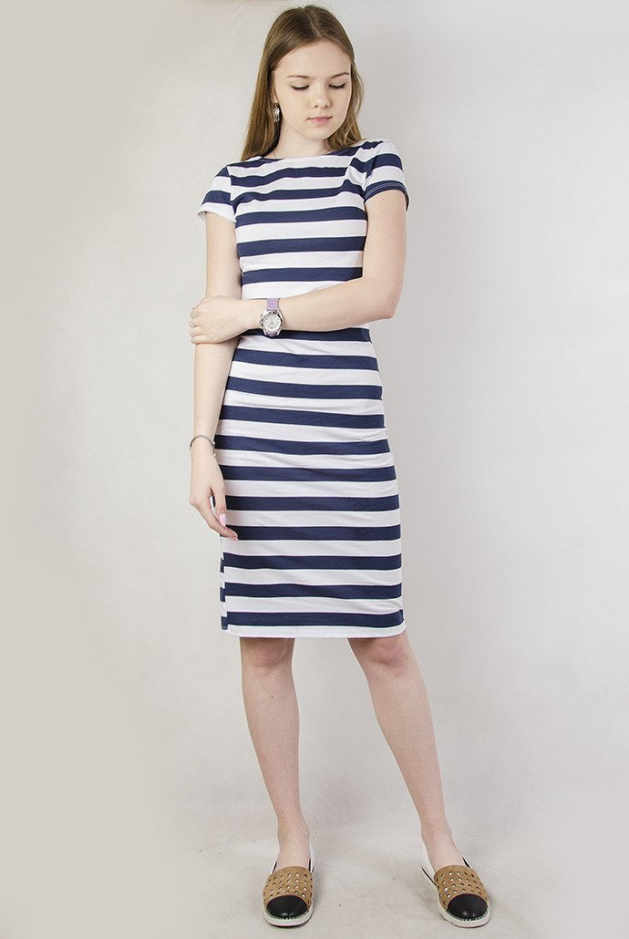 Sukienka w biało-granatowe paski wiązana wstążką z tyłu
