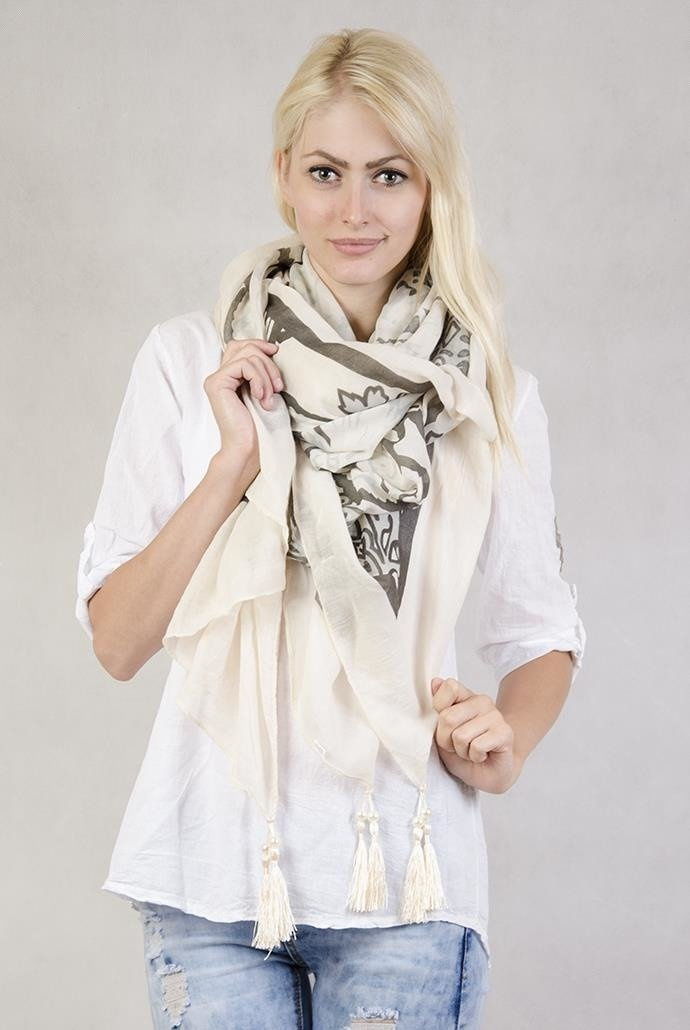 Beżowy szal z ciemnym wzorem i frędzlami