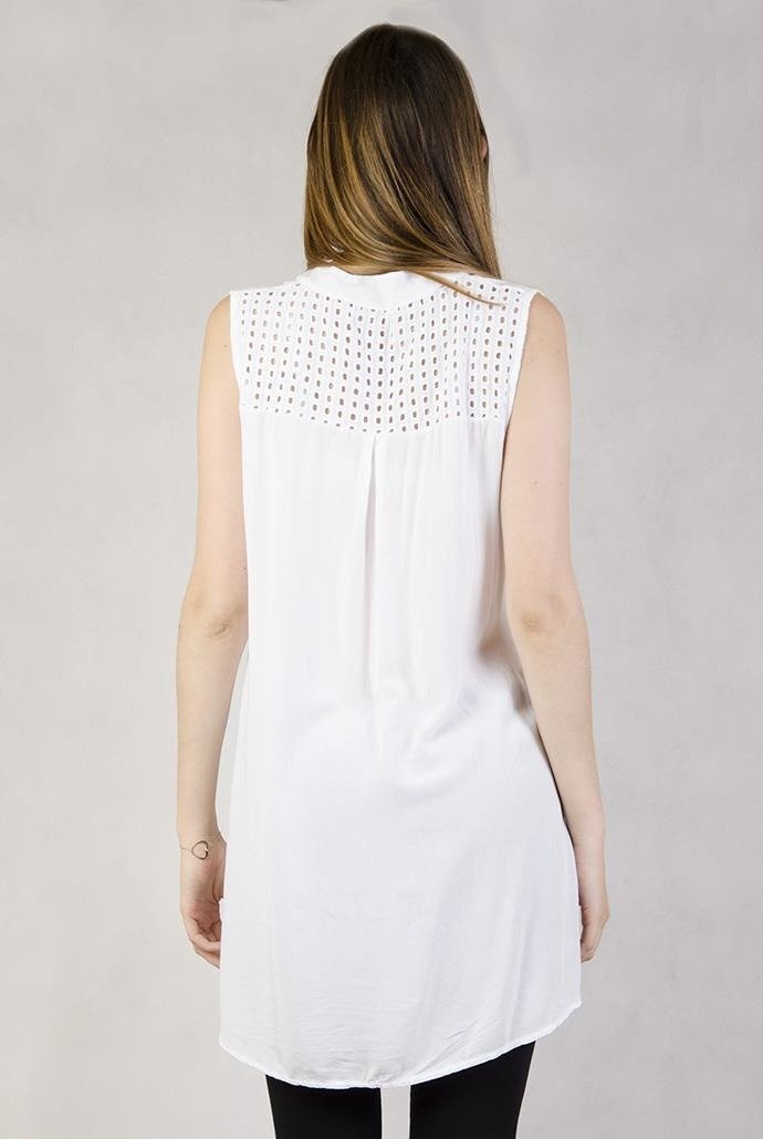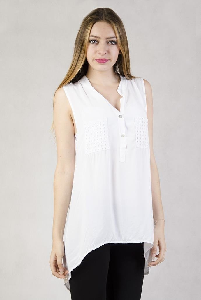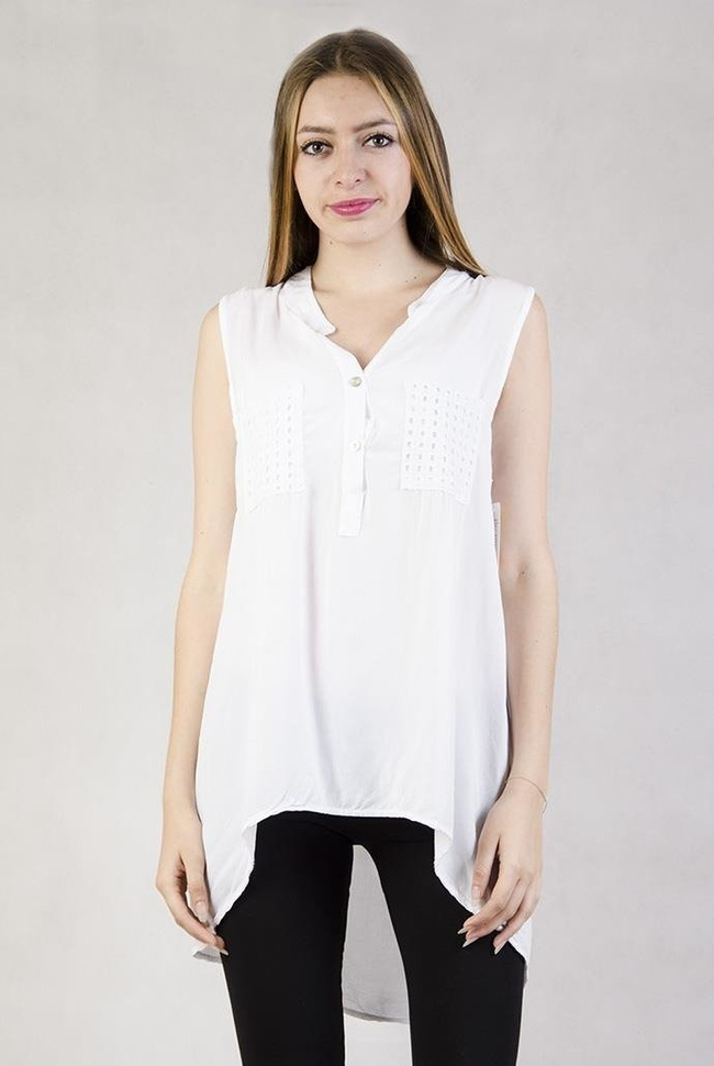 Biała bluzka z przedłużanym tyłem ozdobiona na kieszonkach i plecach