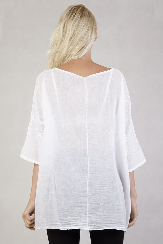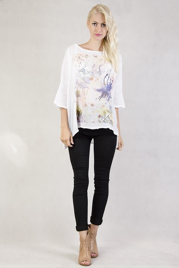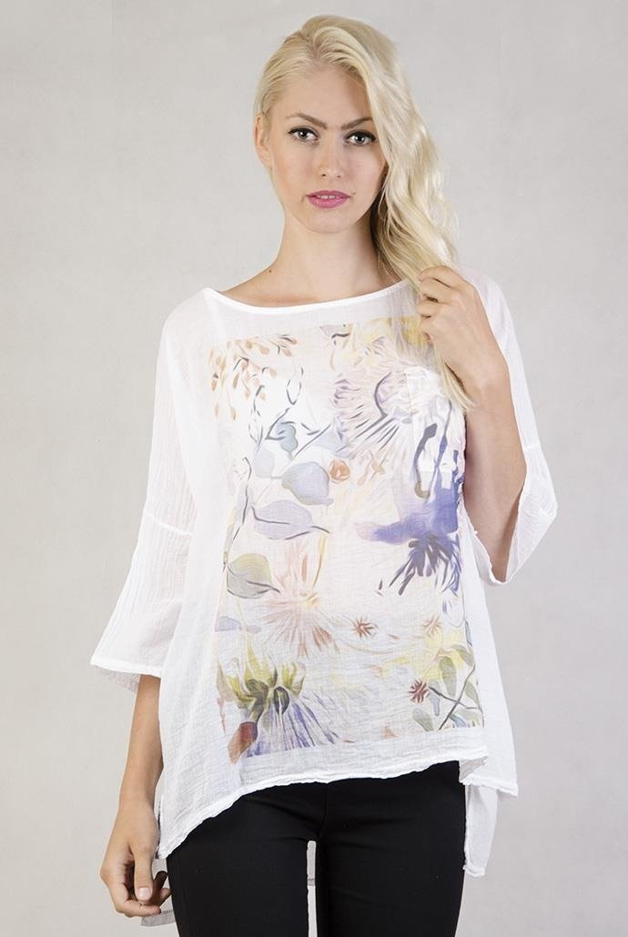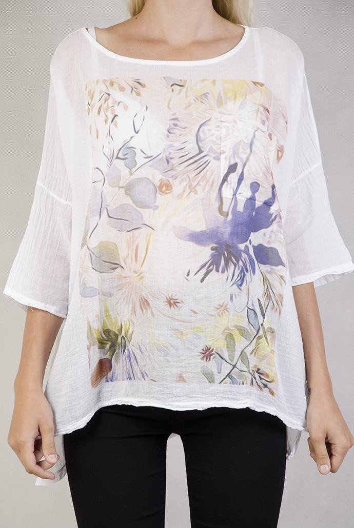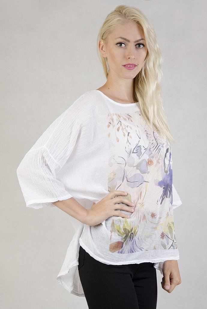 Bluzka biała z pięknym nadrukiem i przedłużanym tyłem