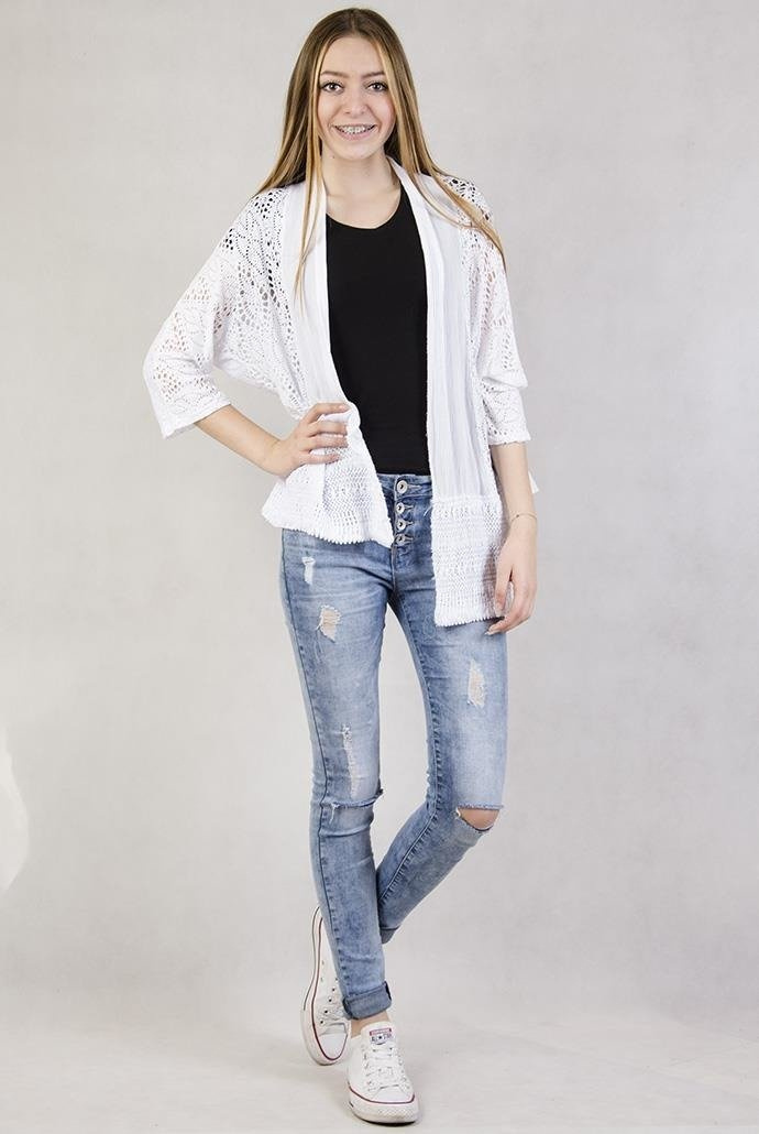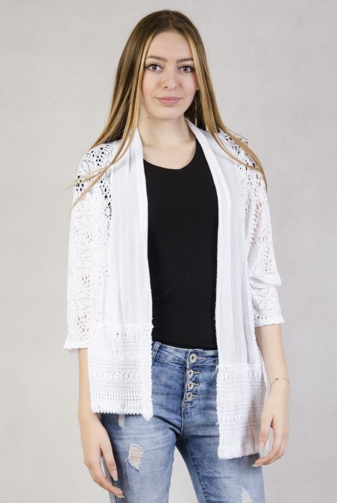 Koronkowa narzutka z szerokim plecionym pasem na dole biała