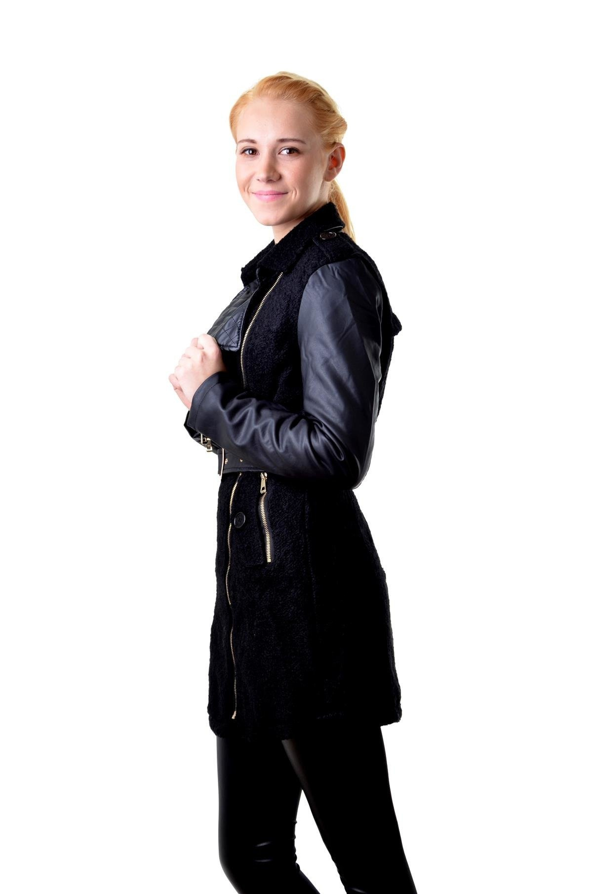 Stylowy i modny płaszcz z elementami ze skóry ekologicznej. Rękawy gładkie, kołnierz pikowany. Zapinany po skosie na zamek, oraz pasek.