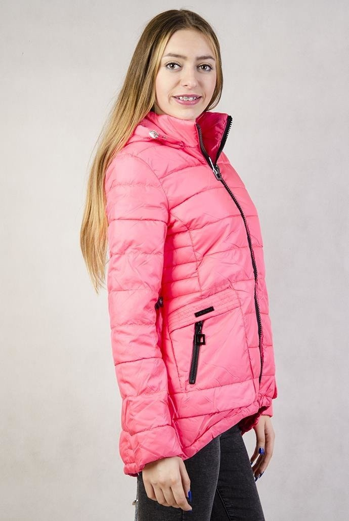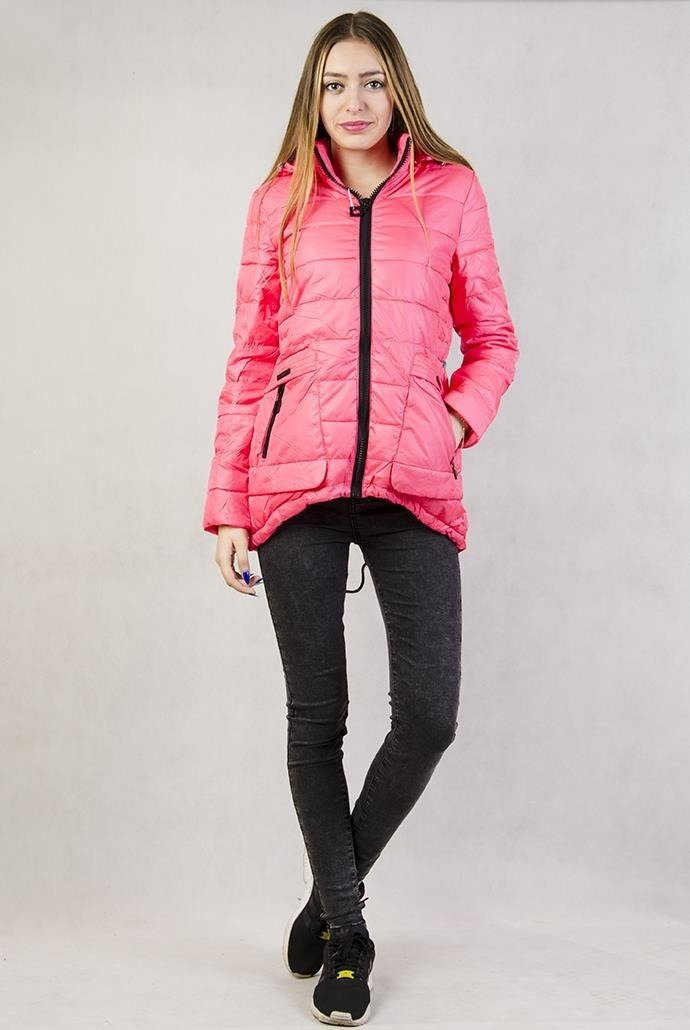 Malinowa, pikowana kurtka z asymetrycznym dołem, ściągana z tyłu