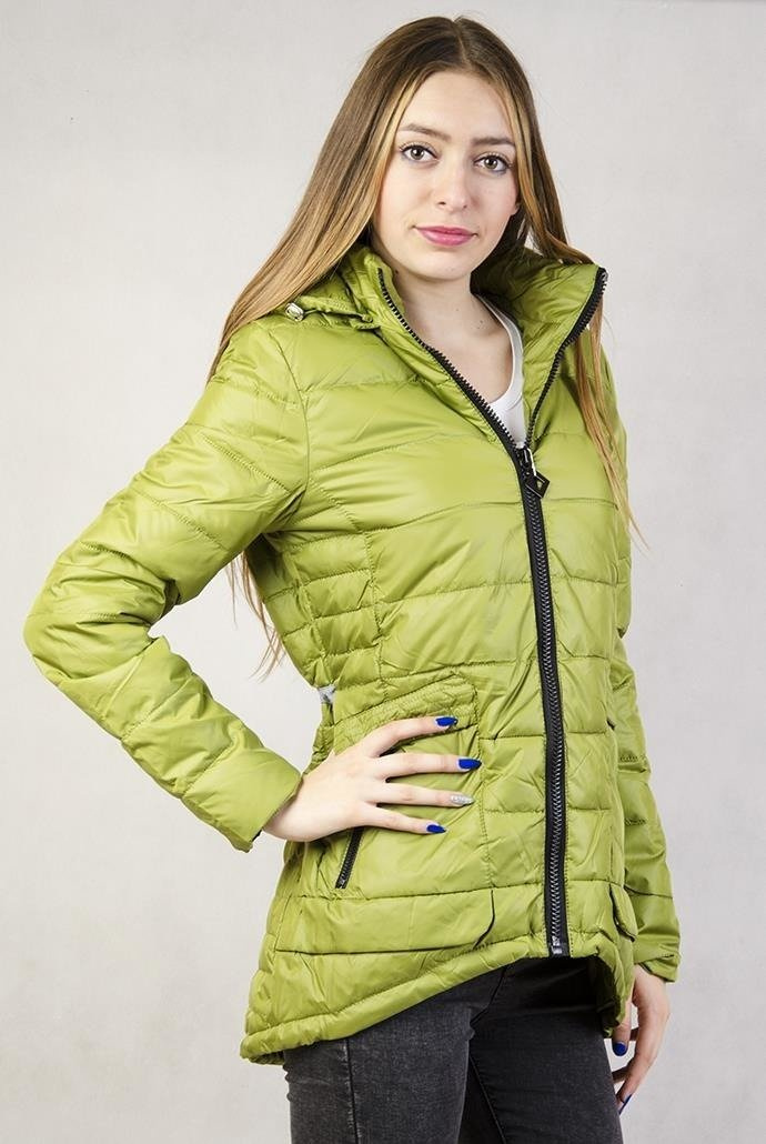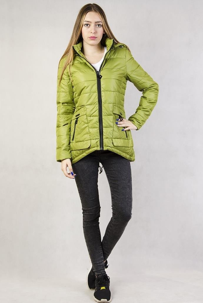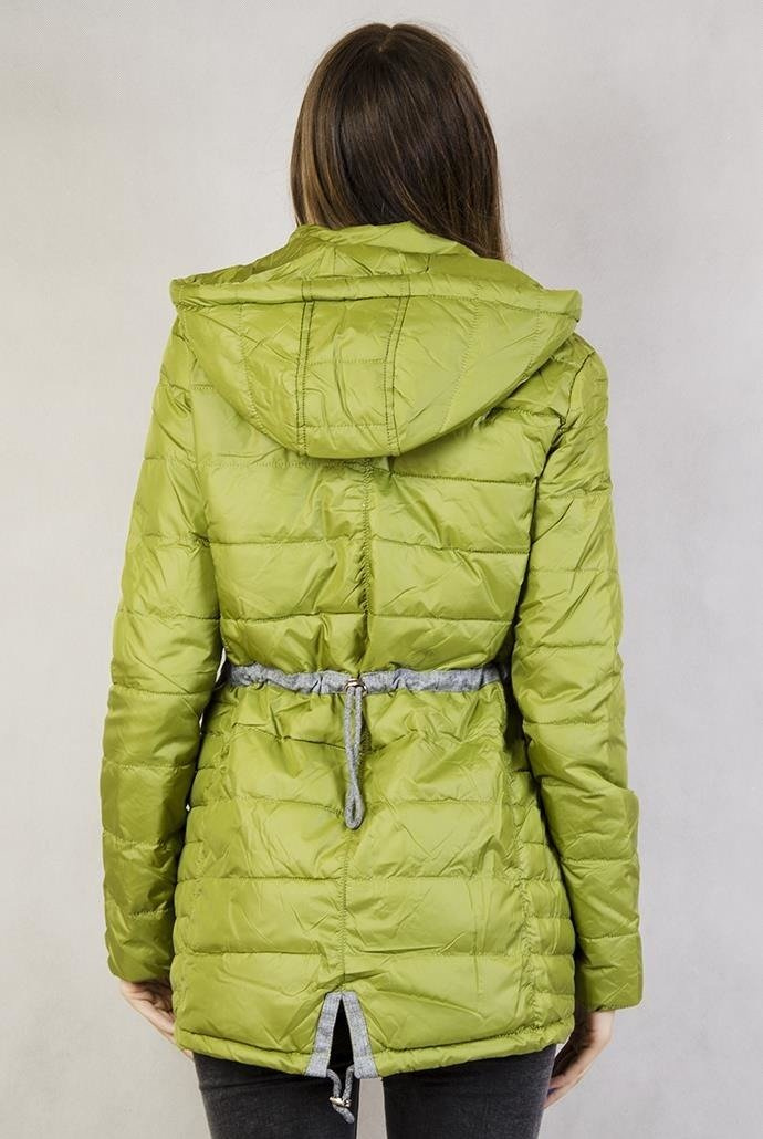 Zielona, pikowana kurtka z asymetrycznym dołem, ściągana z tyłu