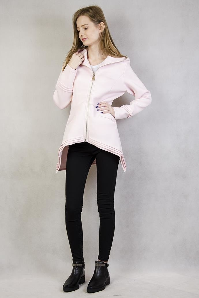 Wygodny, asymetryczny płaszczyk z kapturem.