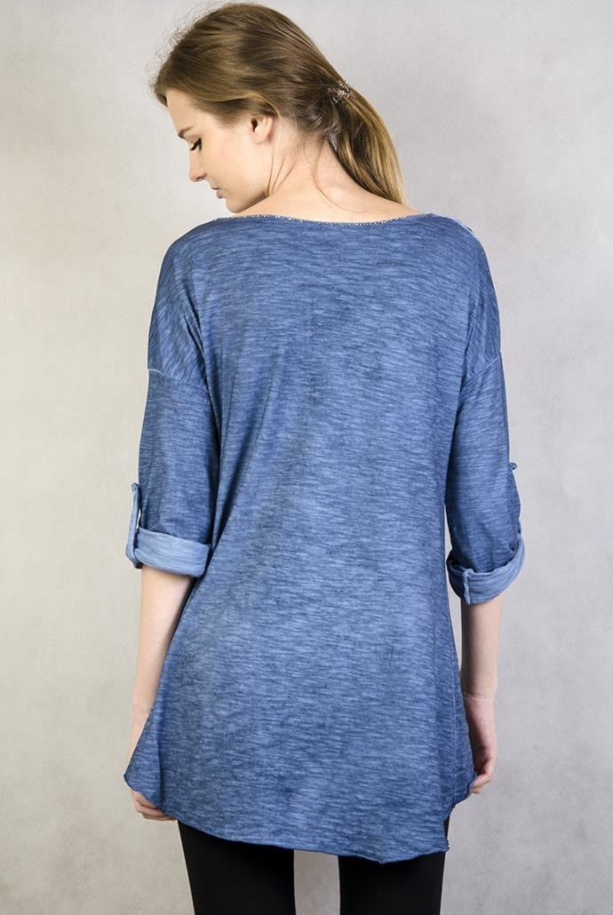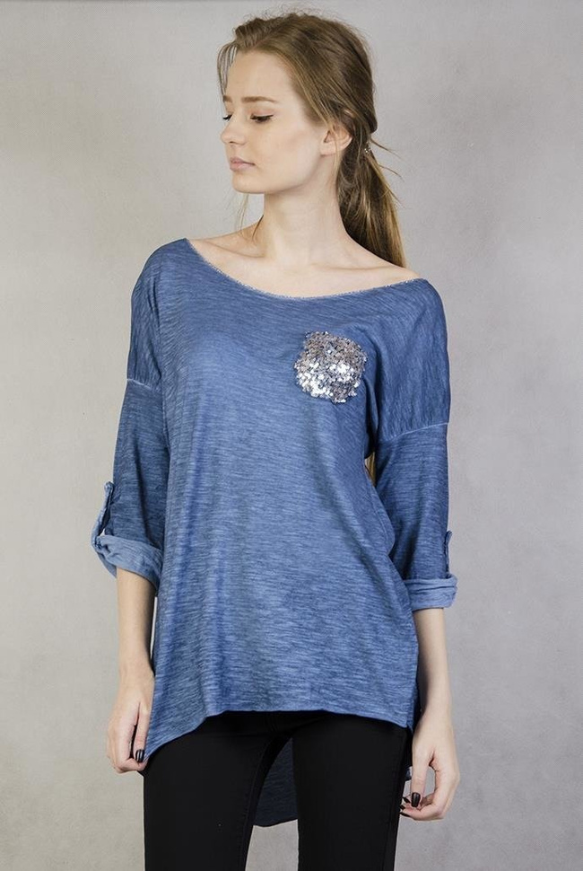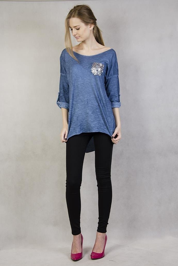 Asymetryczna niebieska bluzka z cekinami umieszczonymi na kieszonce.