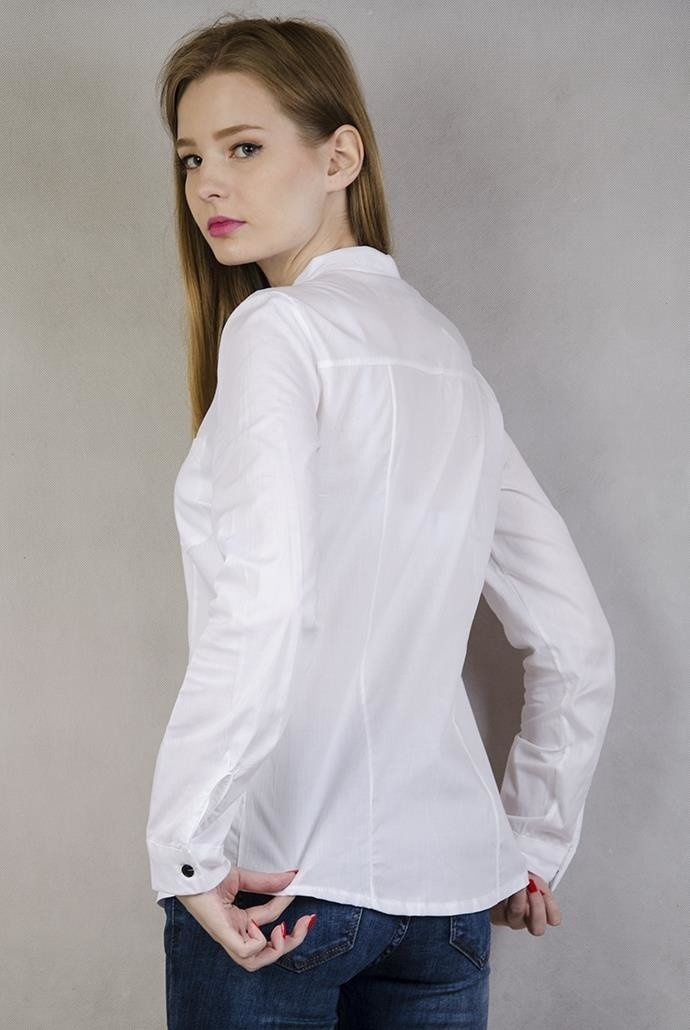 Biała, elegancka koszula z czarnymi guzikami.