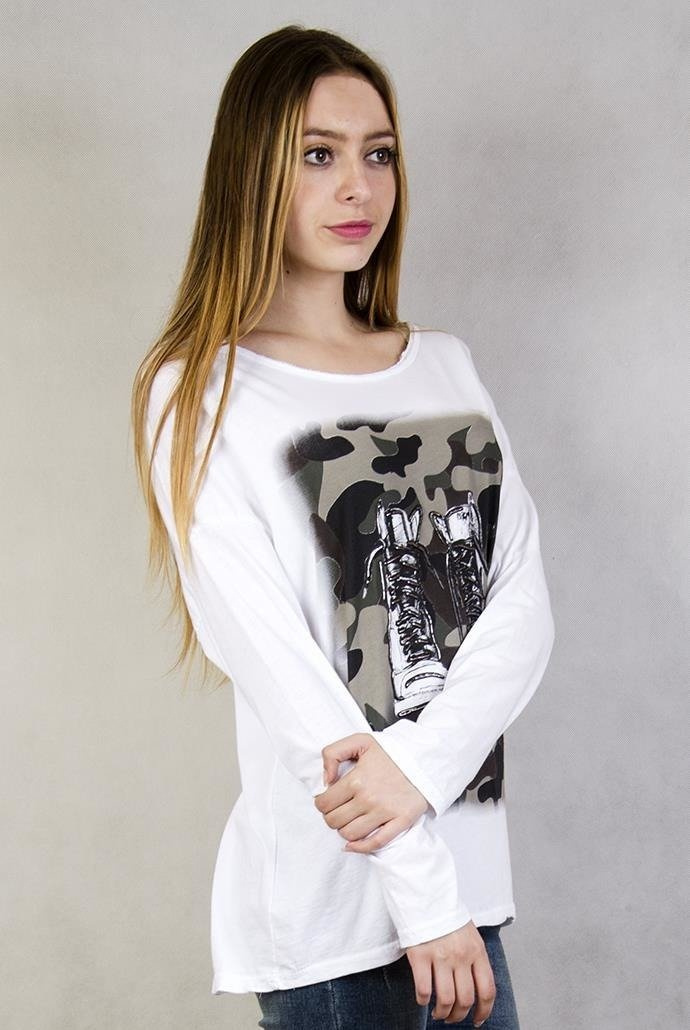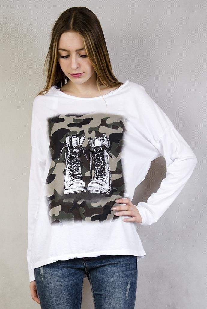 Biała bluzka z wzorem moro i butami w stylu militarnym