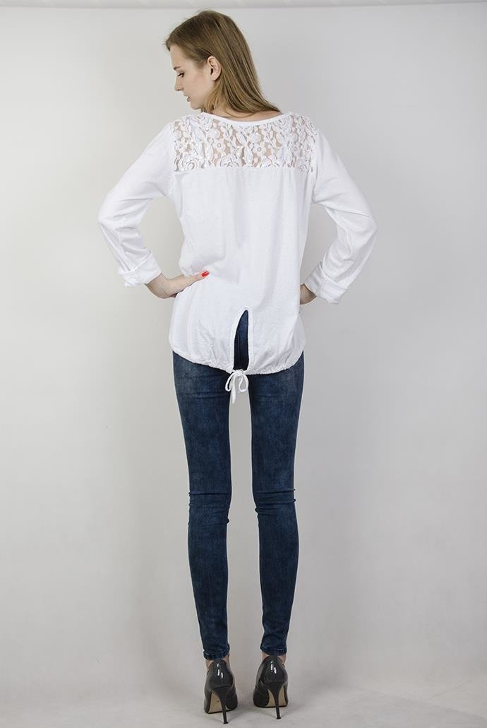 Biała bluzka z guzikami, wzorami przy ramionach i ściągaczem na dole