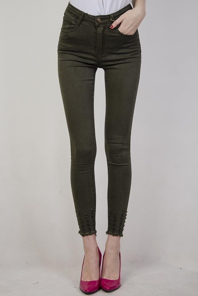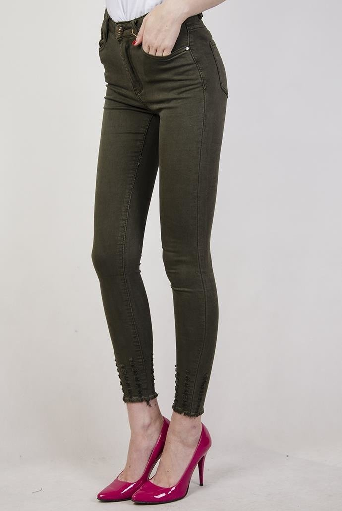Zielone spodnie jeansowe podkreślające figurę z szarpaniami przy nogawce