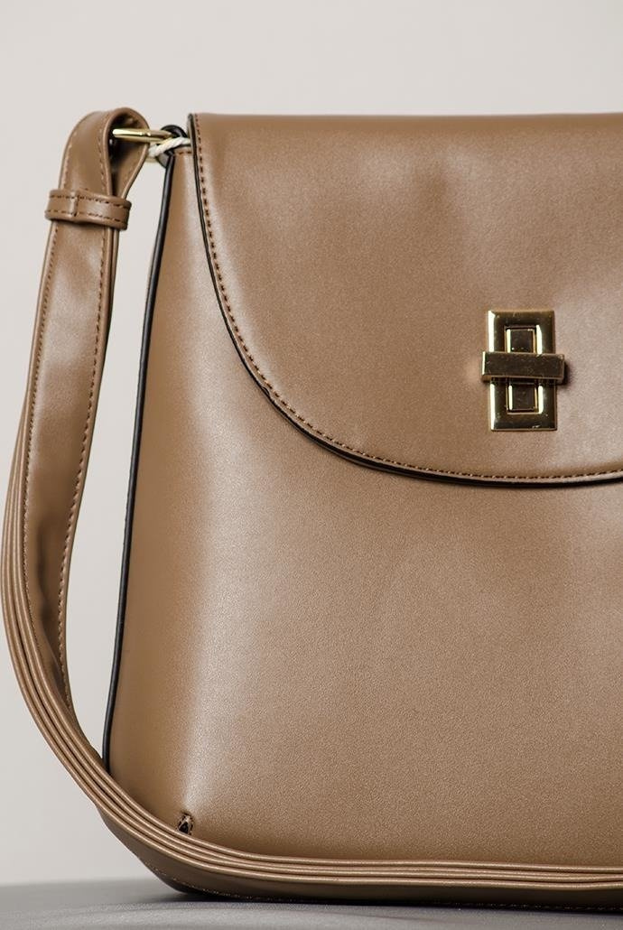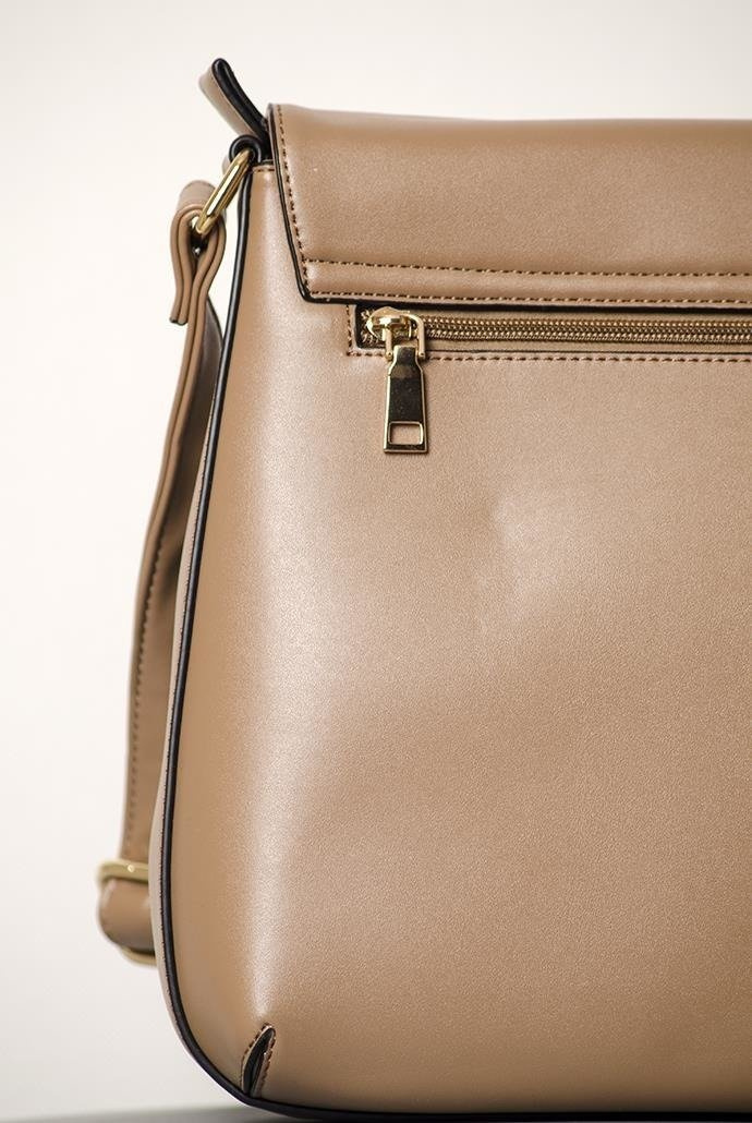 Beżowa torebka na ramię z regulowanym paskiem, z tyłu kieszonka zapinana na zamek.