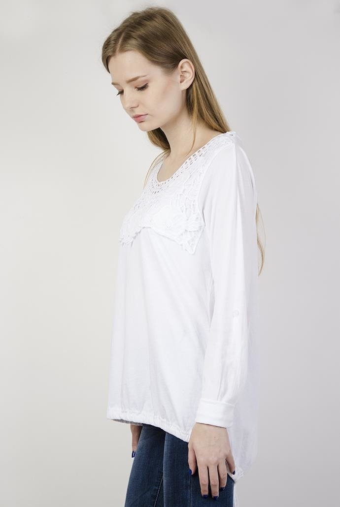 Biała bluzka z ażurowymi zdobieniami przy dekolcie oraz ze ściągaczem na dole