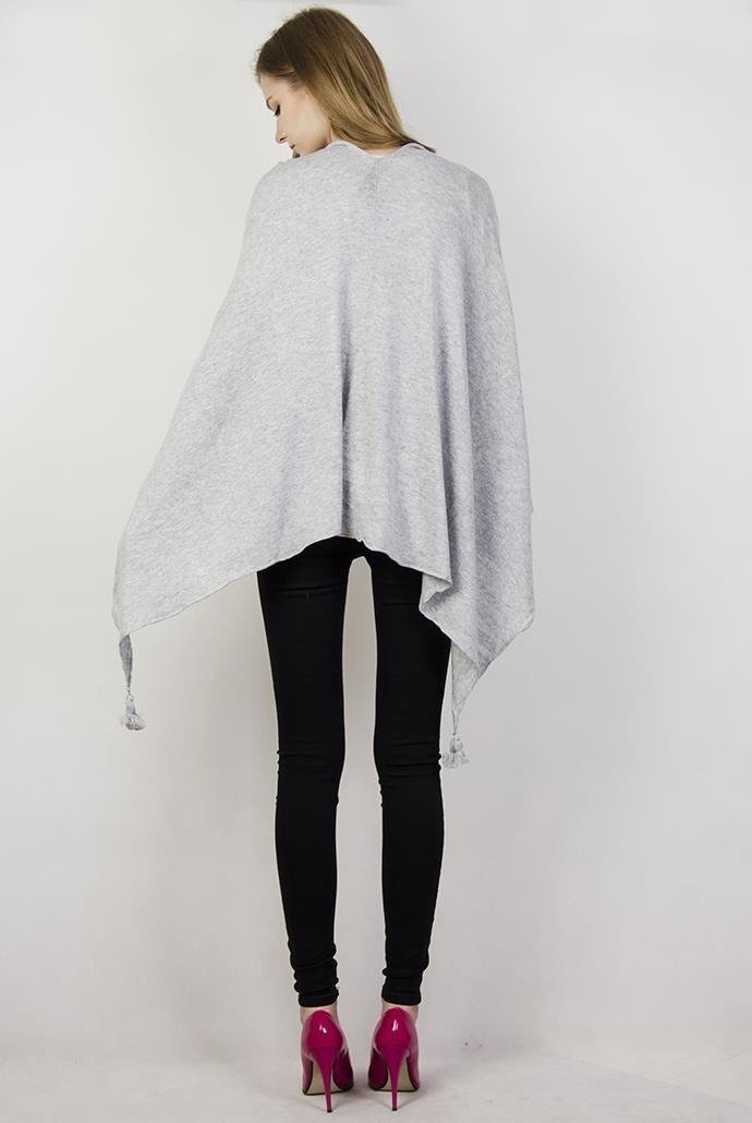 Jasnoszare ponczo z pomponami przy końcach