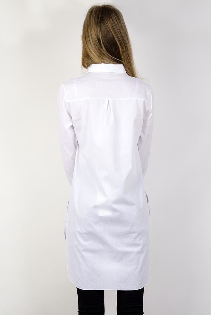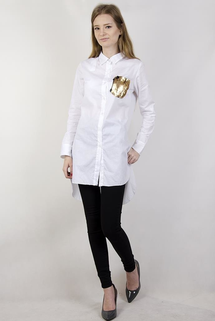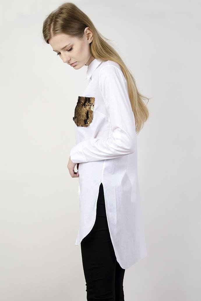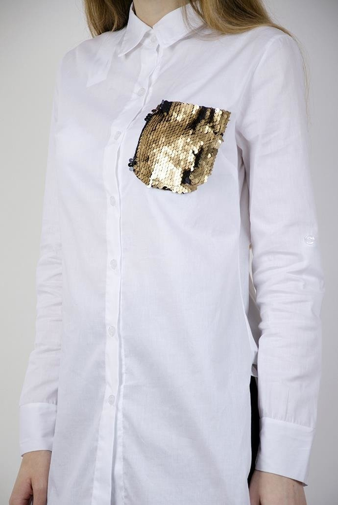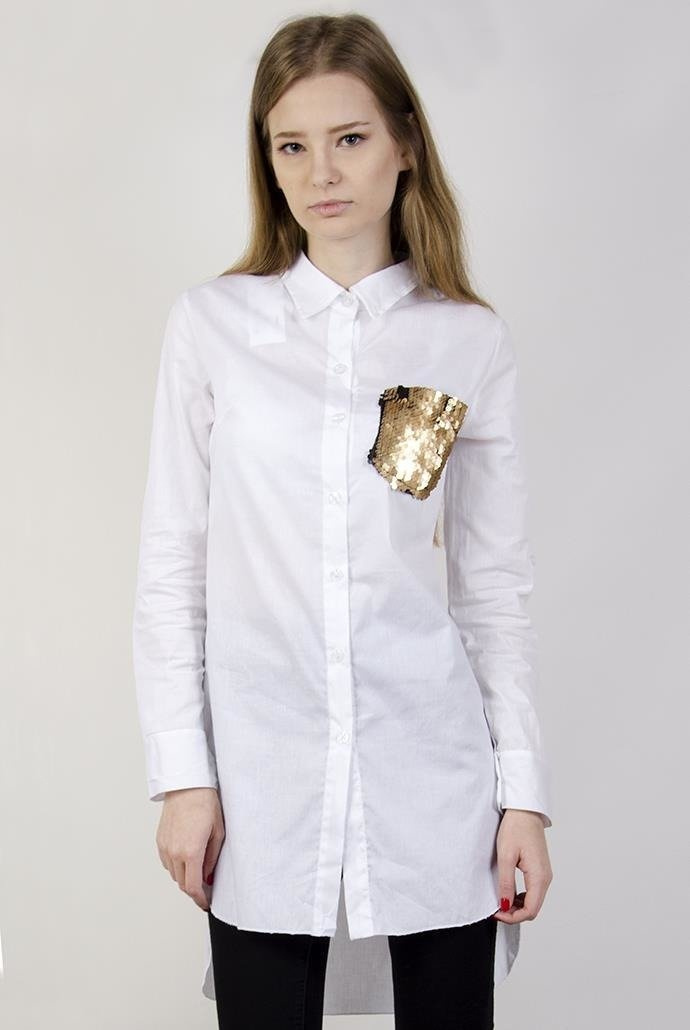 Biała koszula z przedłużanym tyłem i cekinami na kieszonce