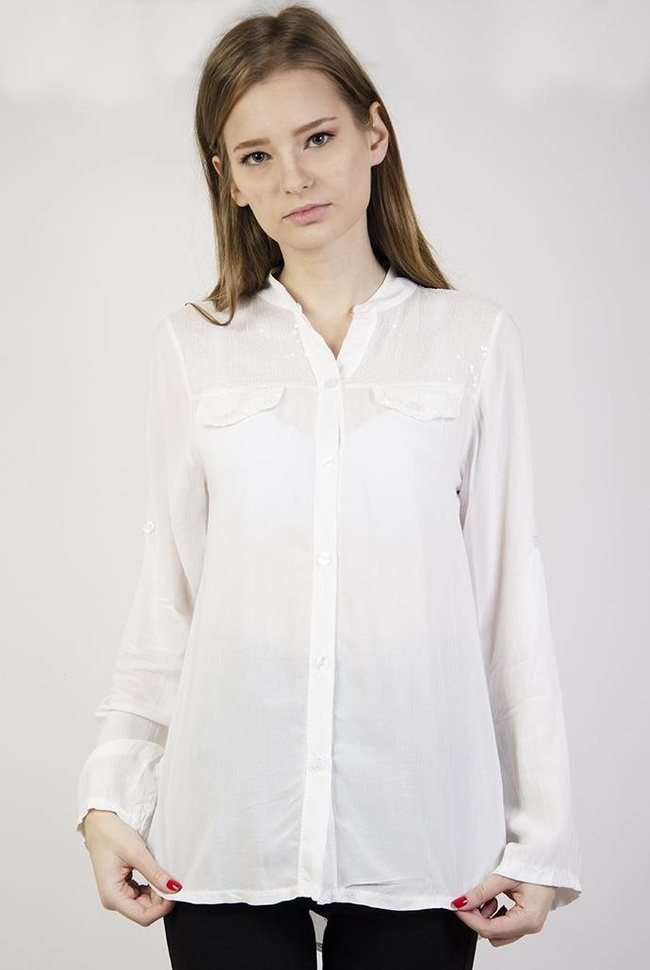 Koszula mgiełka biała z cekinami, asymetryczna Wymiary dla rozmiaru ONE-SIZE: Długość całkowita: 61 cm (przód) 65 cm (tył) Długość rękawa: 59 cm Szerokość pod pachami: 50 cm
