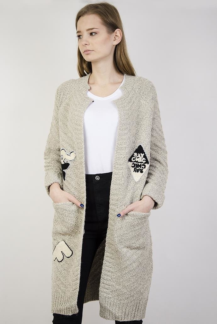 Długi kardigan z domieszką wełny, beżowy, z trzema naszywkami