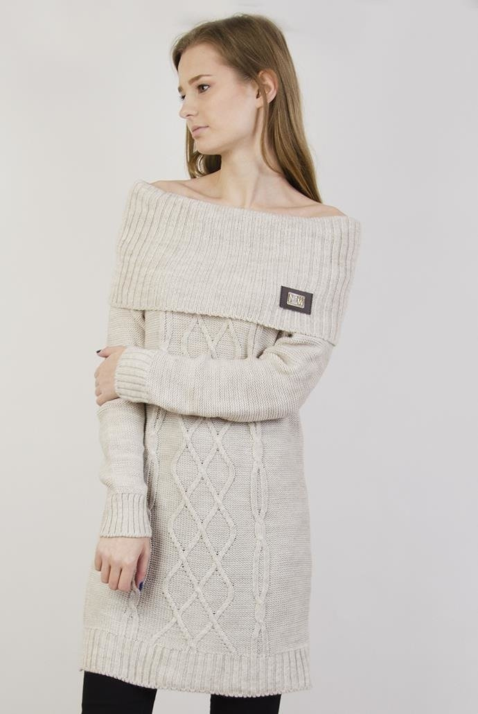 Beżowy przedłużany sweter z szerokim dekoltem i naszywką na dole