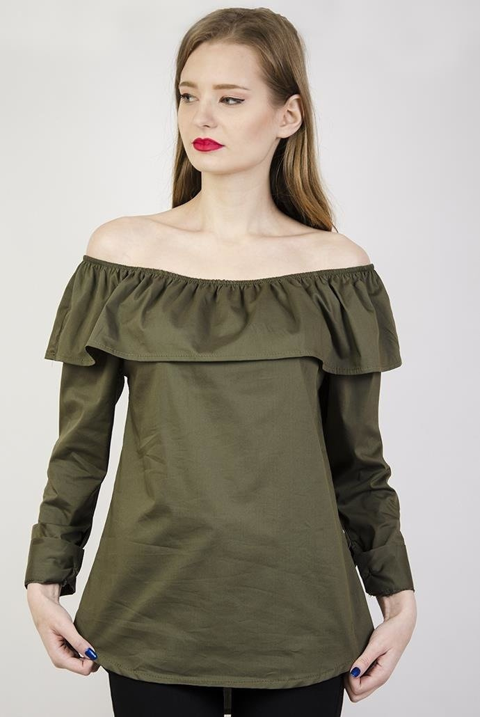 Koszula zielona asymetryczna z hiszpańskim dekoltem, posiada guziki przy rękawach