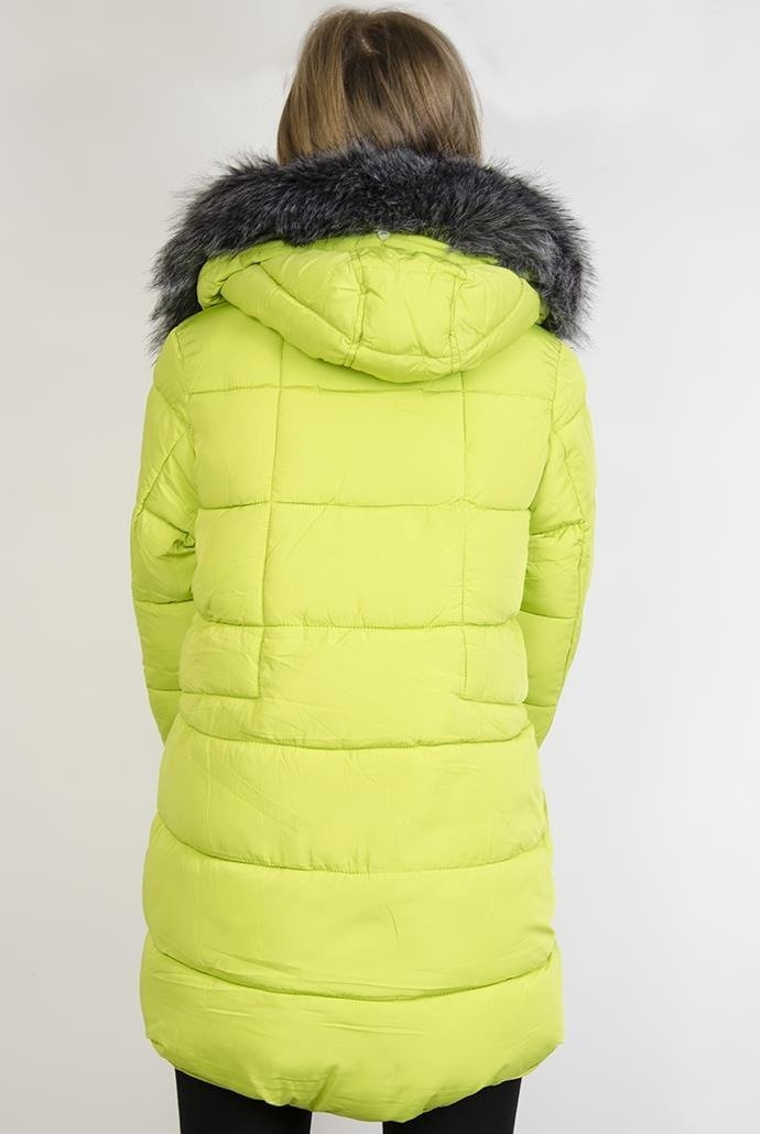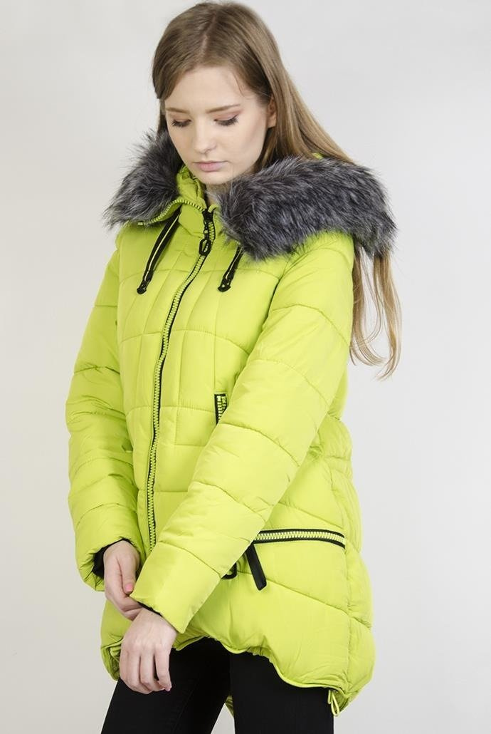 Ocieplana limonkowa asymetryczna kurtka z kapturem.