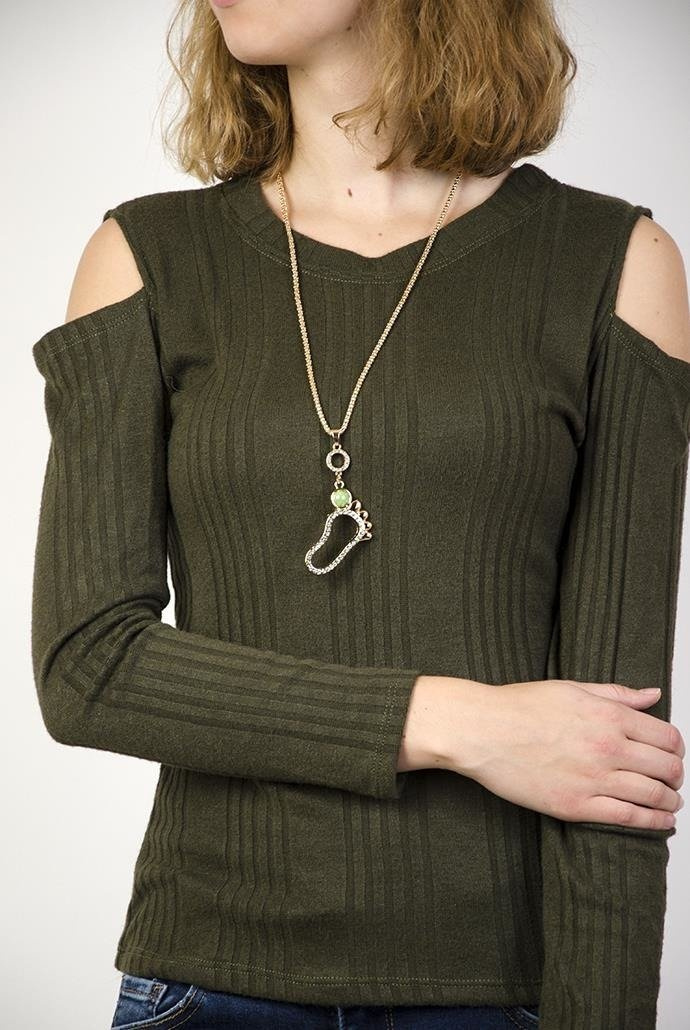 Zielona bluzka z wycięciem na ramionach + wisiorek