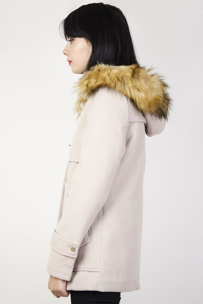 BEŻOWY PŁASZCZ JESIENNO-ZIMOWY ZAPINANY ZA ZAMEK I KLAMRY, KAPTUR NA ZAMEK Z FUTERKIEM