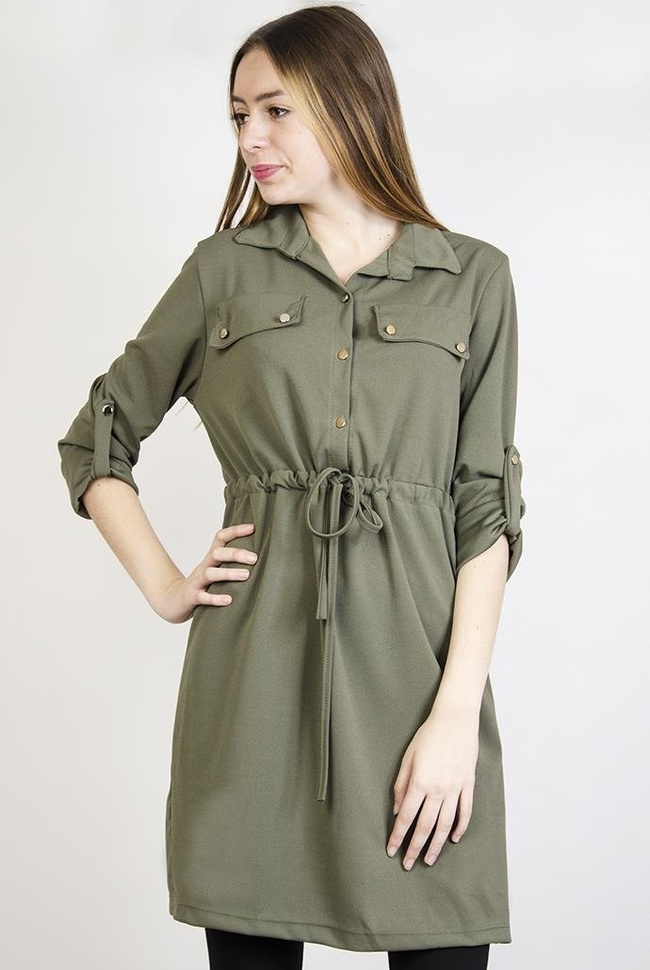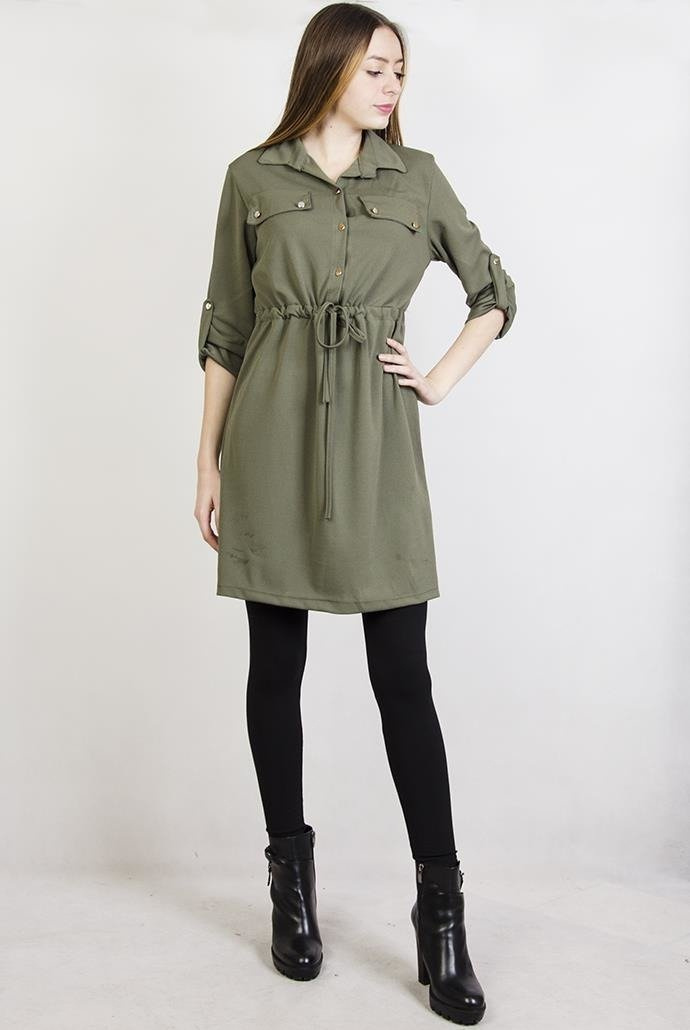 Zielona sukienka ze ściągaczem w talii, posiada złote guziczki i długi rękaw.