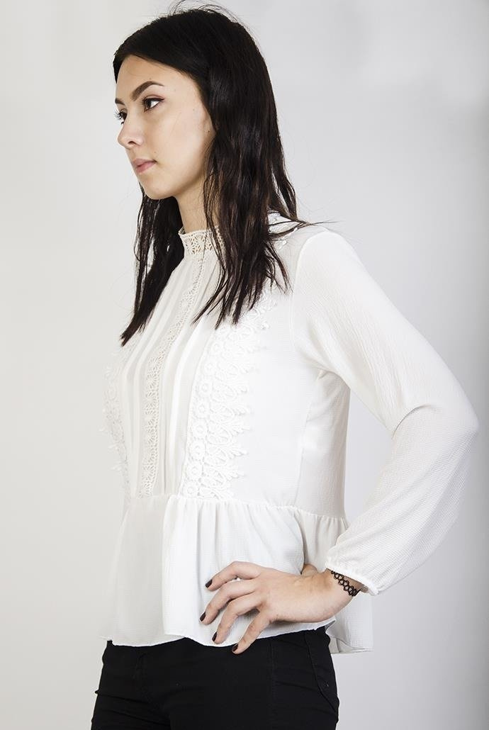 Biała bluzka szyfonowa z ażurowymi zdobieniami