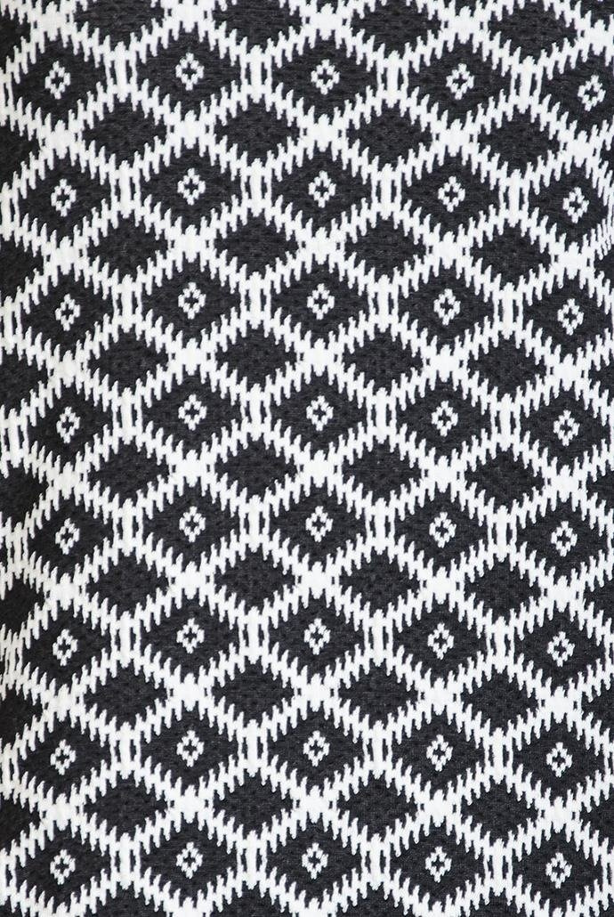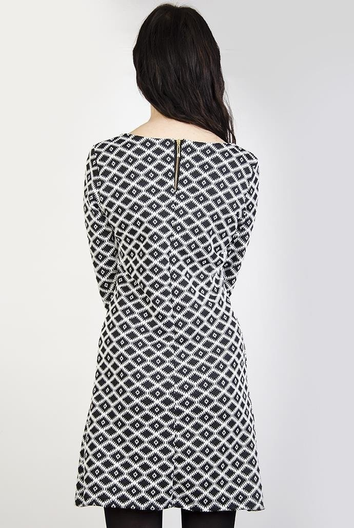 Biało-czarna sukienka w romby z rękawem o długości 7/8.