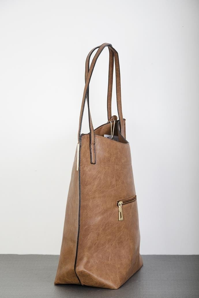 Duża torebka mieszcząca A4, z gładkiej tekstury, posiada krótkie rączki oraz zawieszkę ze złotymi wstawkami.