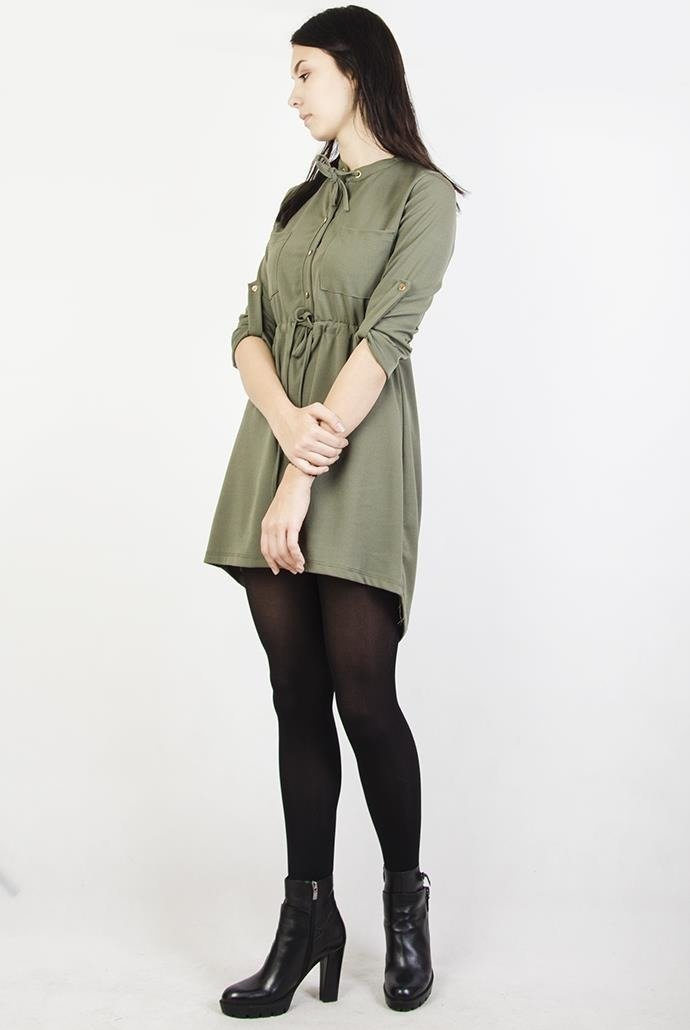 Asymetryczna sukienka zielona z wiązaniem przy szyi oraz w talii, posiada dwie kieszonki.