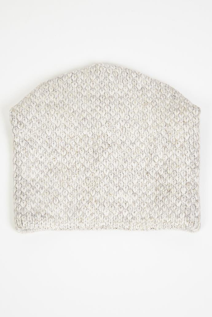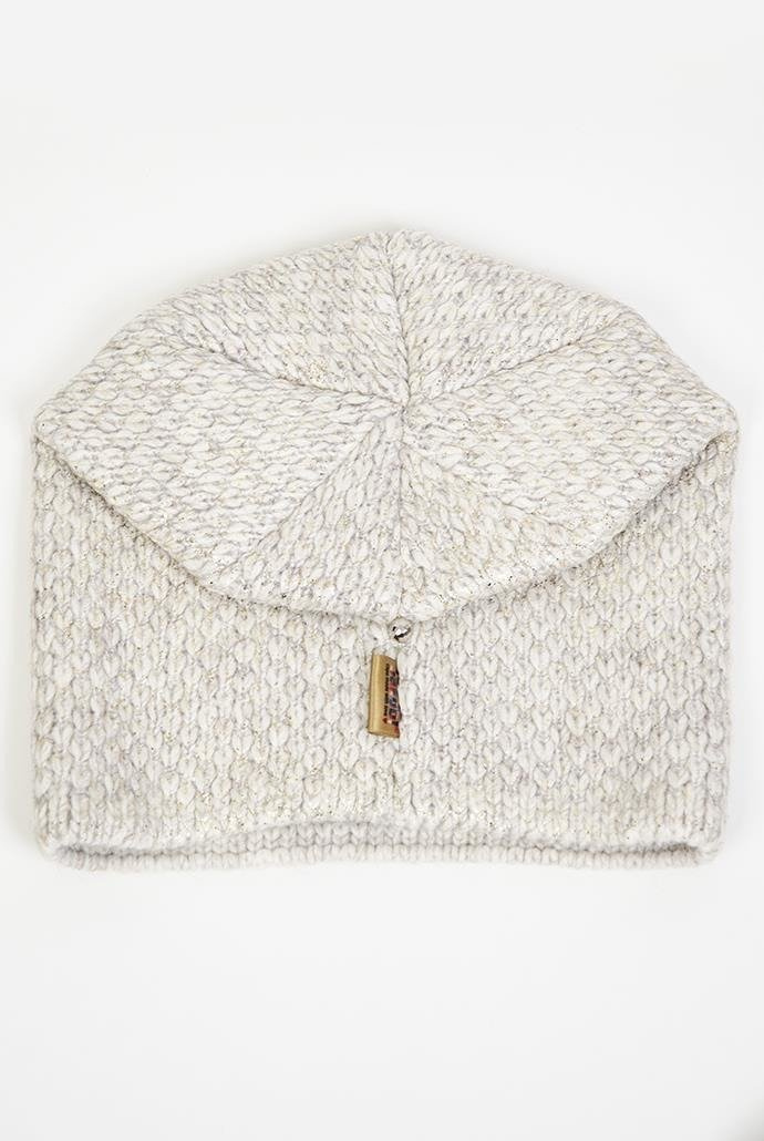Beżowa czapka ze złotymi akcentami, z tyłu posiada przeszycie oraz srebrną kulkę.