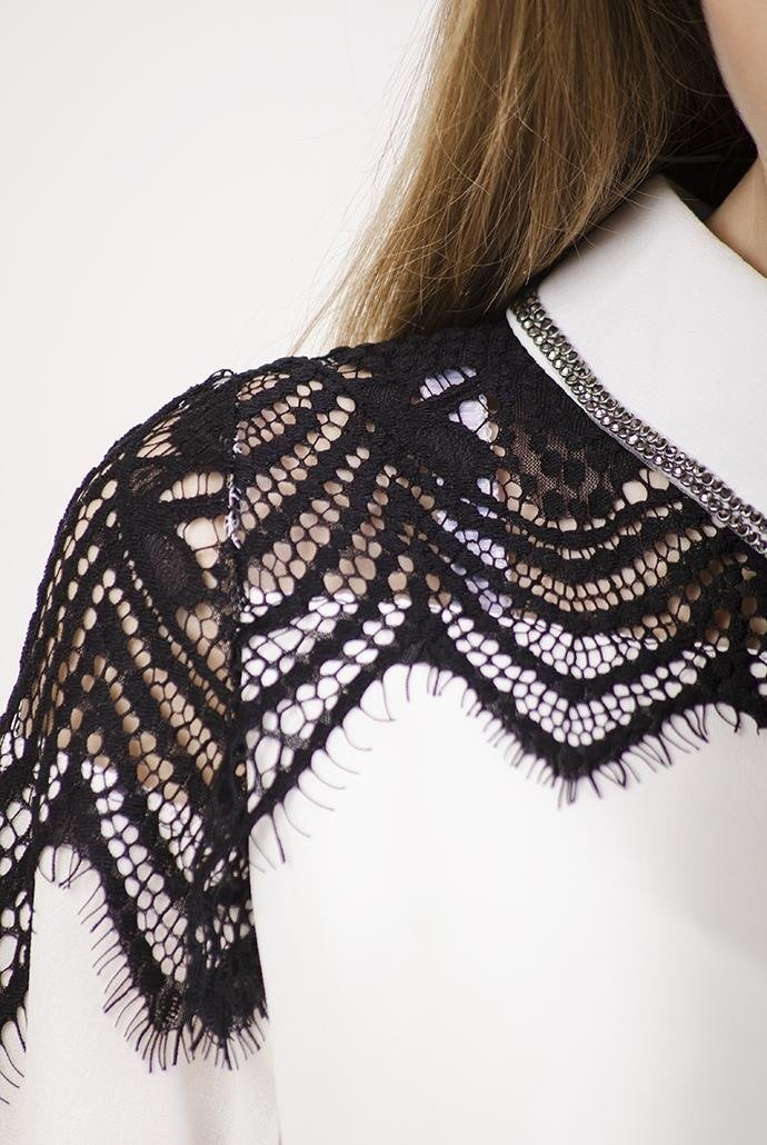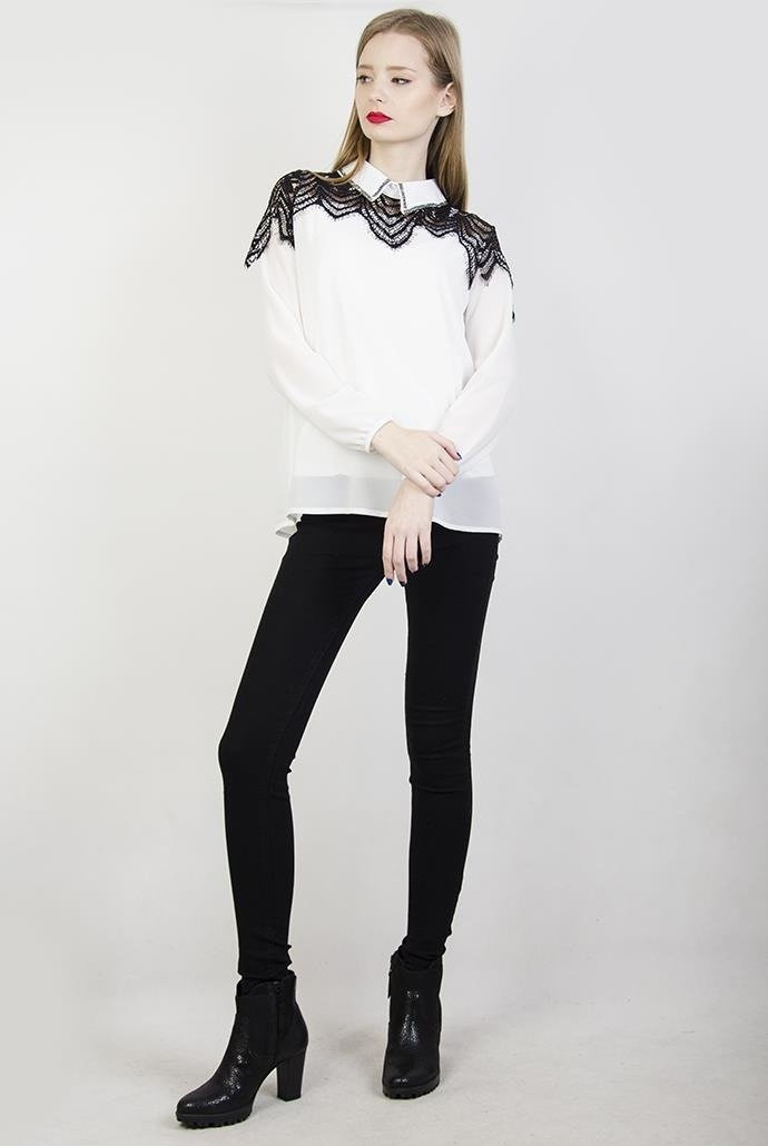 Biała koszula z czarnym, ażurowym zdobieniem. Posiada zdobiony kołnierz.