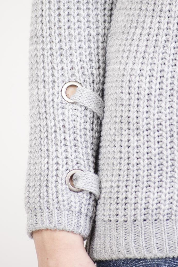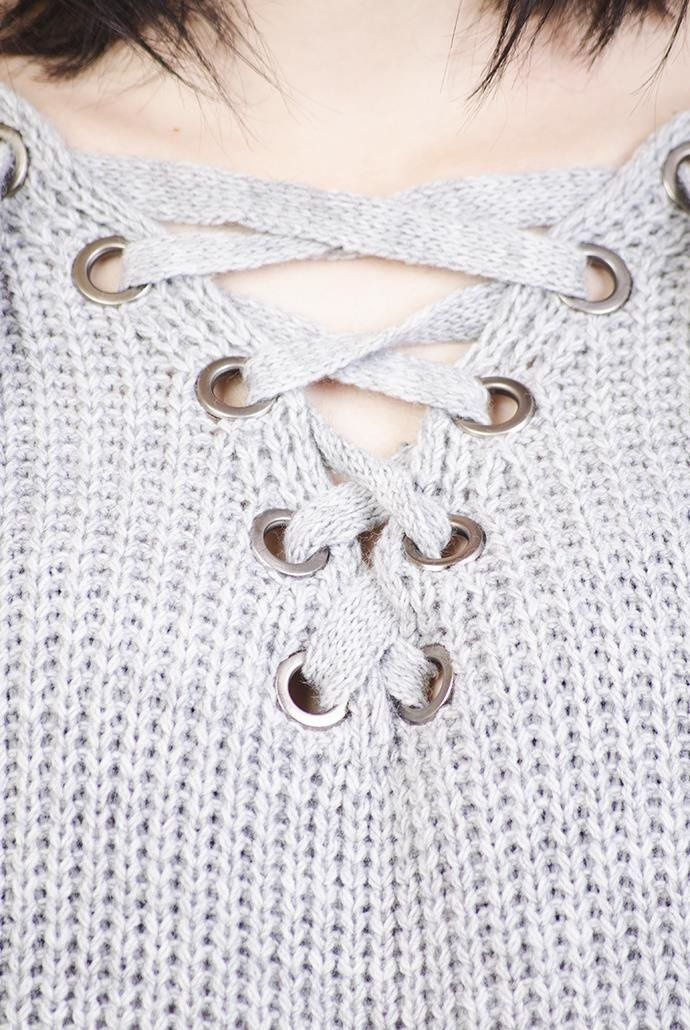 Szary sweter z wiązaniem w dekolcie.